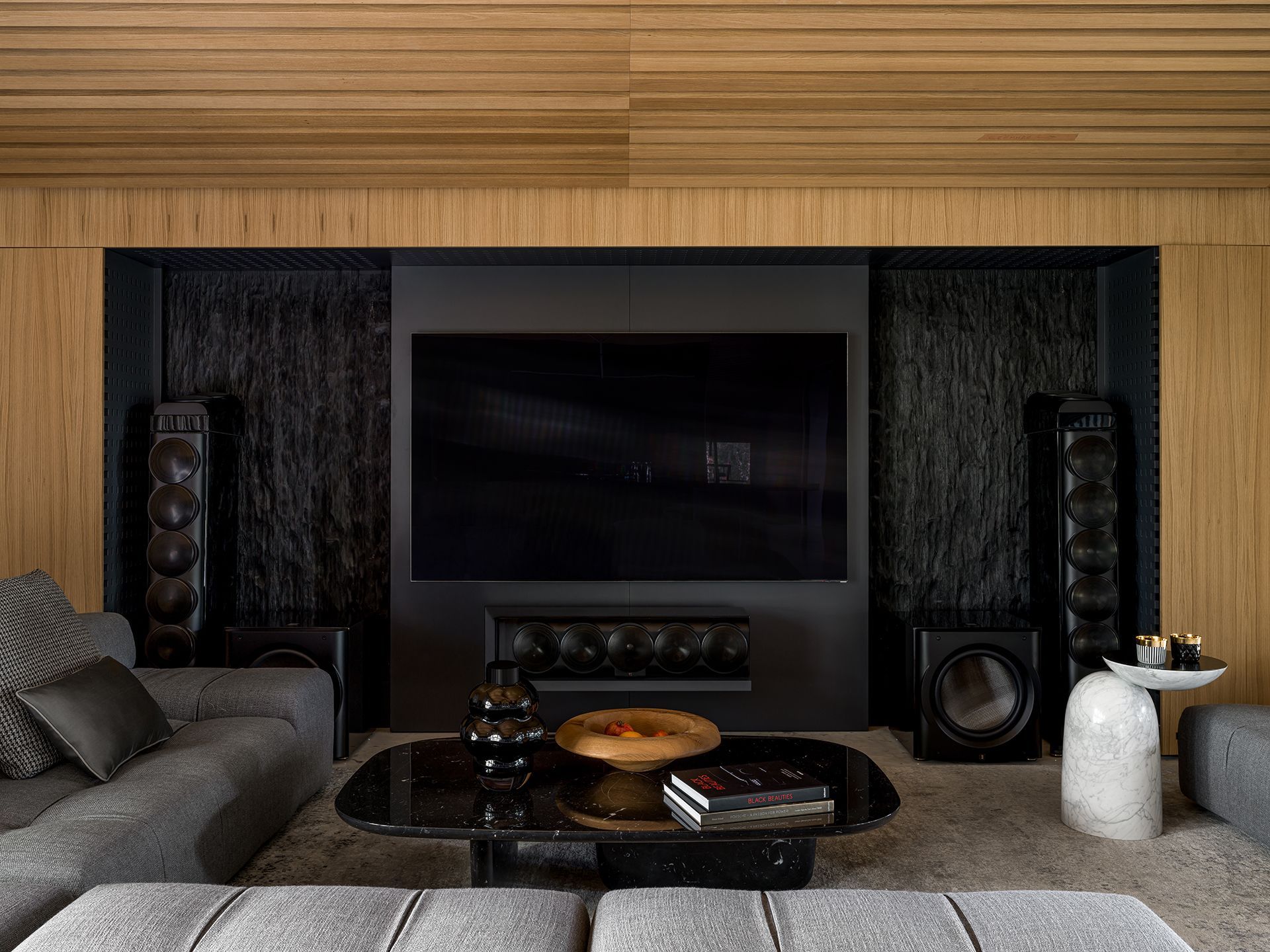 Эффект оказался не только технологичным, но и эстетичным: акустика буквально «растворилась» в пространстве. Визуальная доминанта осталась за черной декоративно долблёной несущей деревянной стеной — техника на её фоне стала настолько выразительной, что достойна отдельного конкурса красоты.