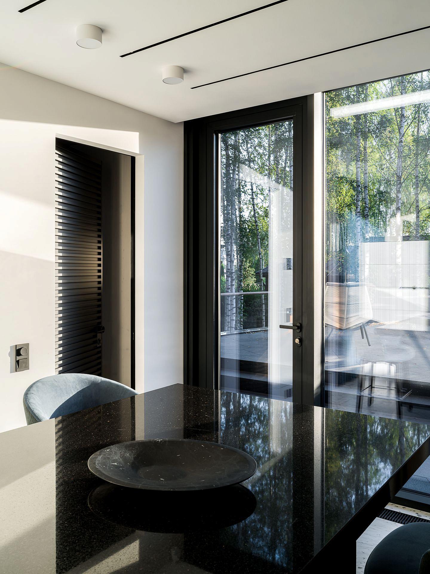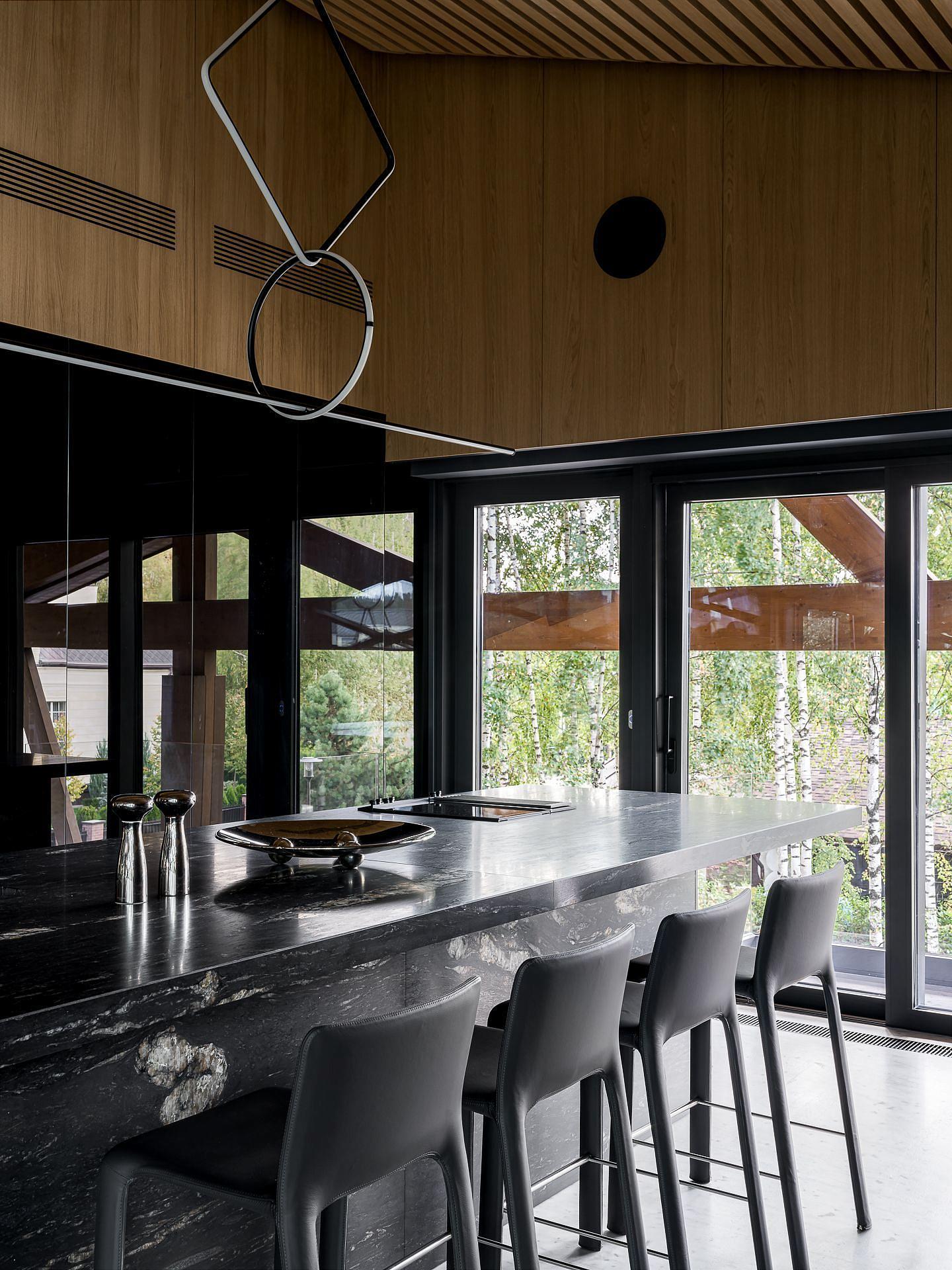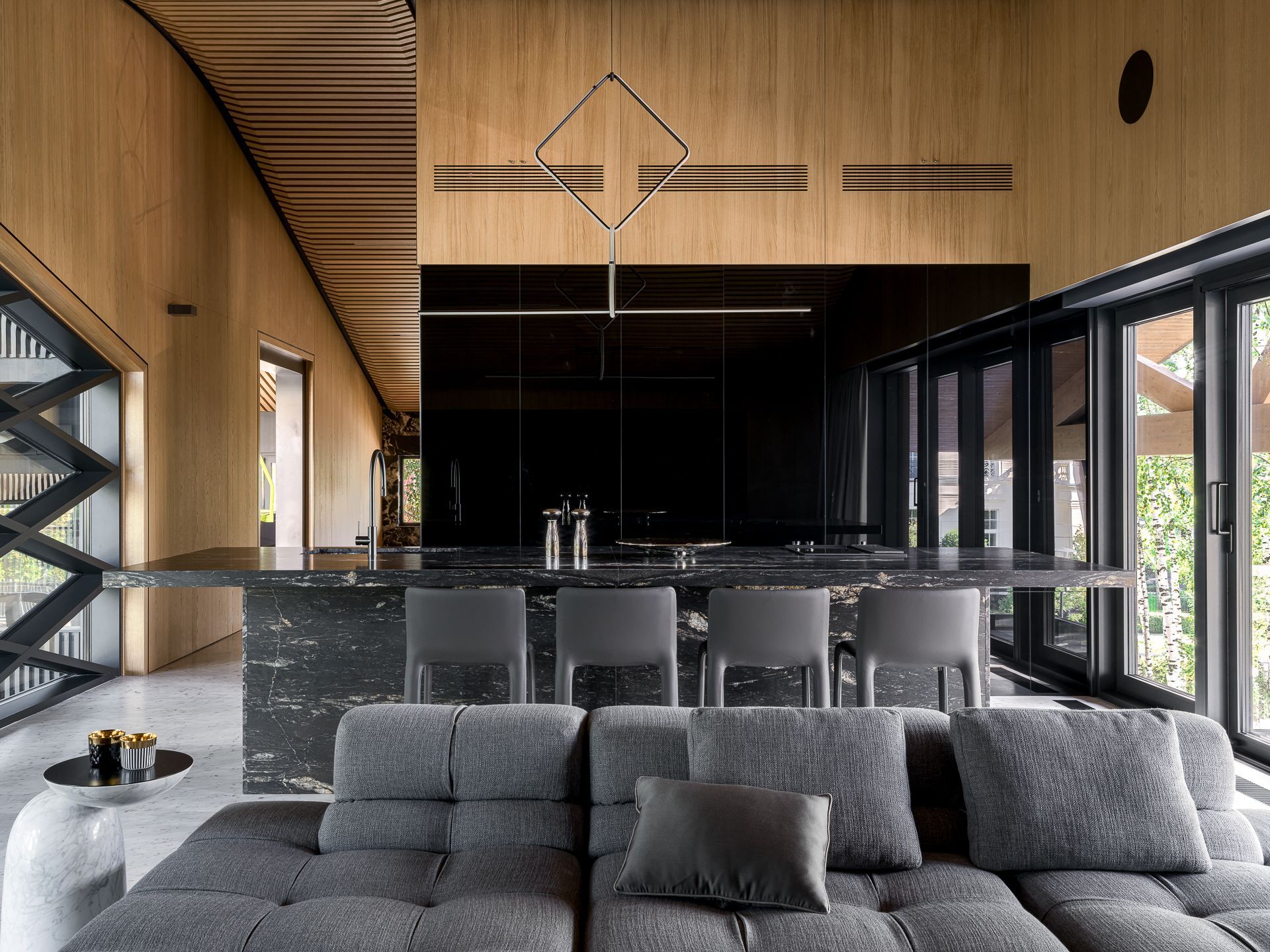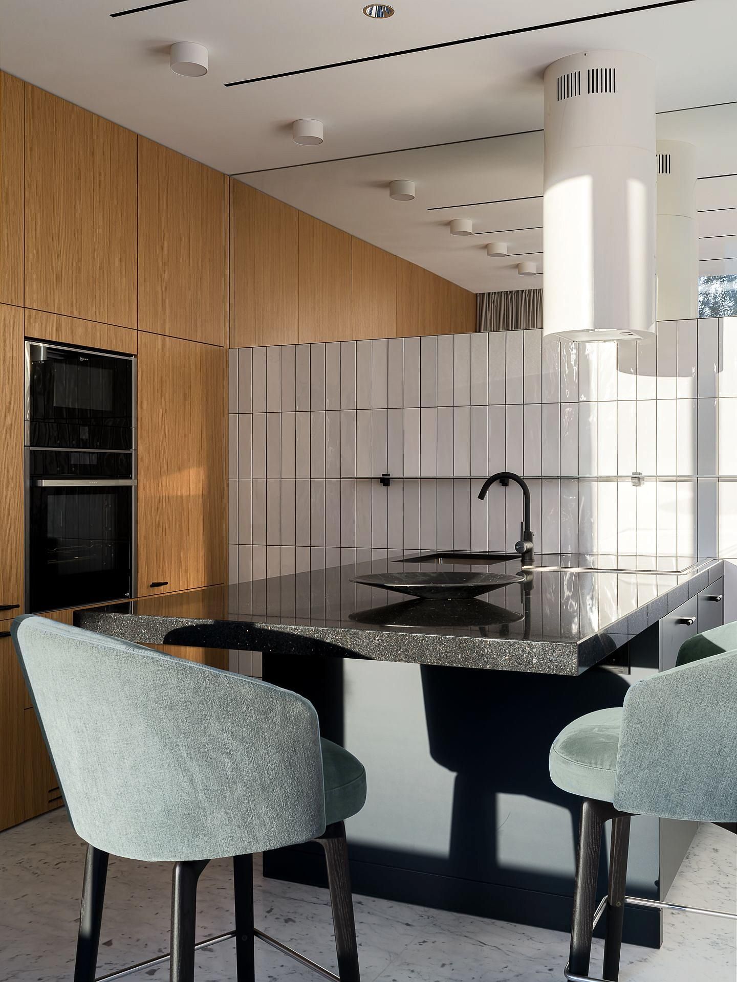 Главная тема дизайна - контраст и фактура. Здесь встречаются микро-цемент и каррарский мрамор Bianca Gioia, светлый дуб и обожжённая ель, пять видов камня в разных обработках — от полировки до «кожи» и термо. Встроенная мебель — авторская, от мраморных раковин до подсвеченных зеркал с анти-запотеванием. Через огромное ромбическое окно можно присматривать за спортсменами. Это лучший вид на спортзал и Атланта. Гостиная с балконом на березовую рощу. Зона бара оборудована индукционной плитой с вытяжкой, встроенной в столешницу. Функционал кухони абсолютно незаметен. Тонированные зеркала встроенной мебели и серые шторы создают ощущение обволакивающего спокойствием кокона. Киберспортсмены могут комфортно располагаются на большом диване.