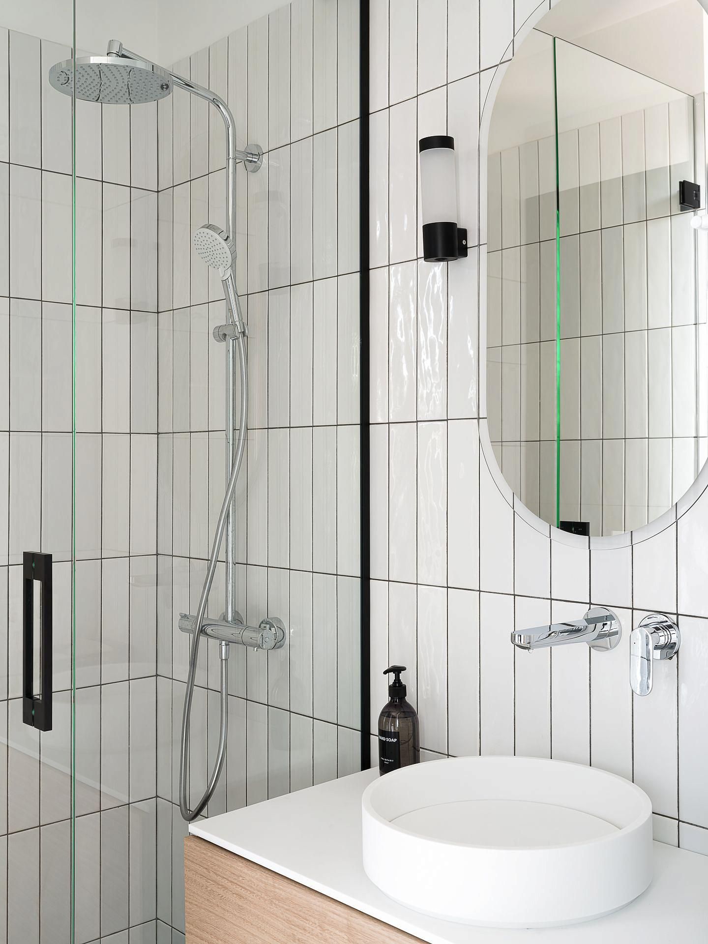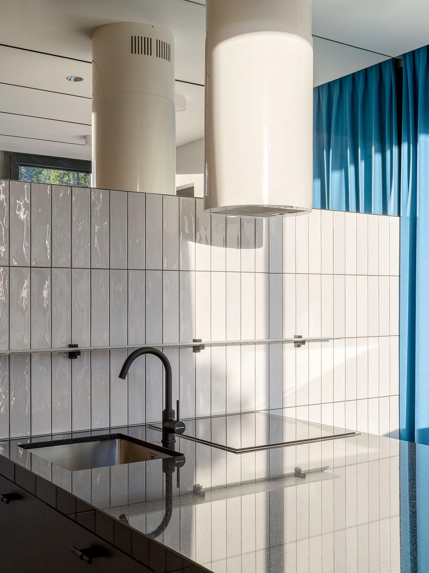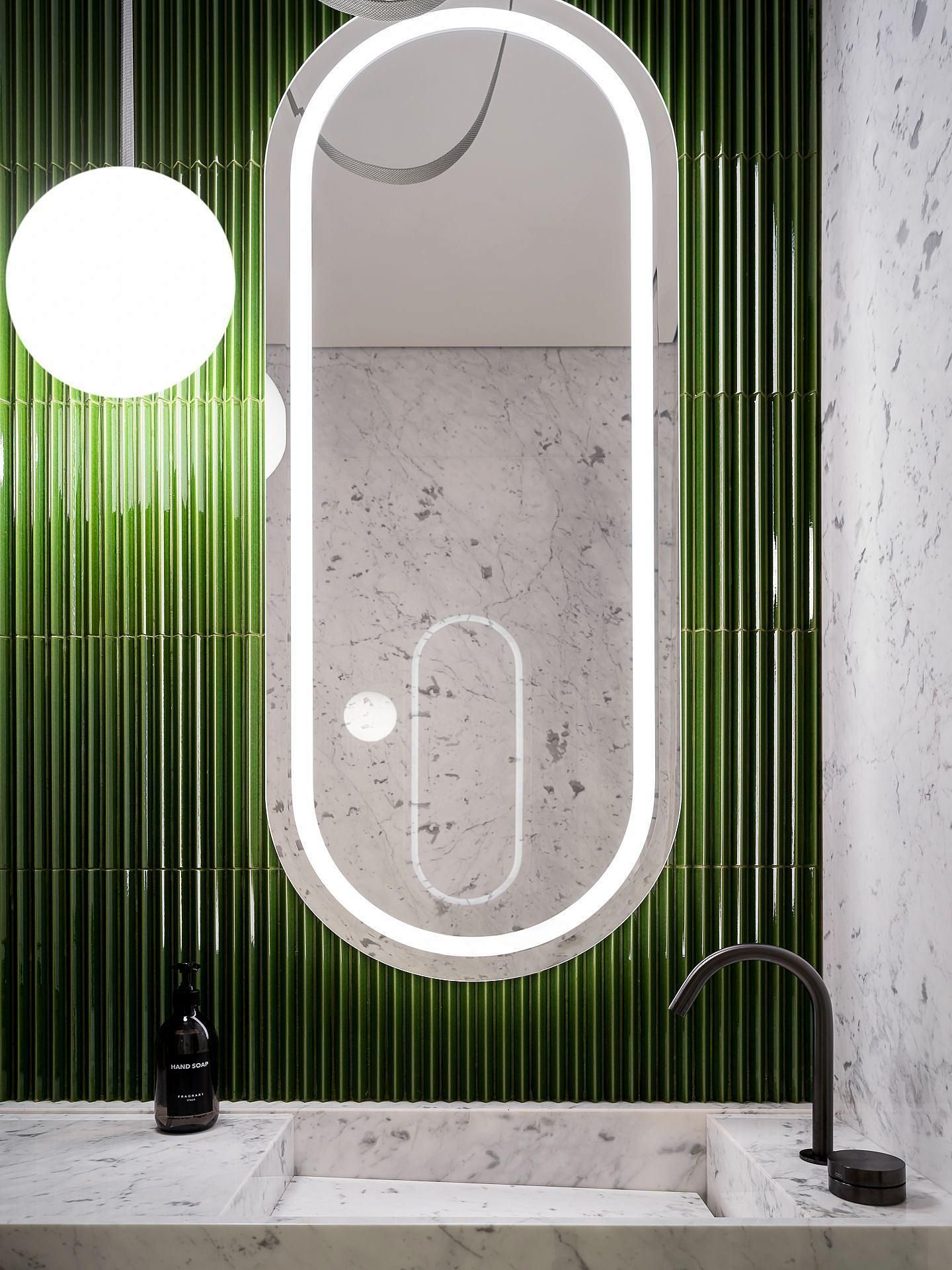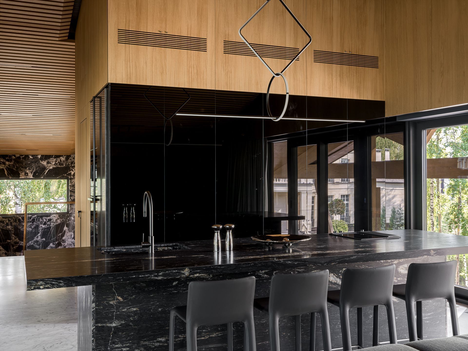 Главная тема дизайна - контраст и фактура. Здесь встречаются микро-цемент и каррарский мрамор Bianca Gioia, светлый дуб и обожжённая ель, пять видов камня в разных обработках — от полировки до «кожи» и термо. Встроенная мебель — авторская, от мраморных раковин до подсвеченных зеркал с анти-запотеванием. Через огромное ромбическое окно можно присматривать за спортсменами. Это лучший вид на спортзал и Атланта. Гостиная с балконом на березовую рощу. Зона бара оборудована индукционной плитой с вытяжкой, встроенной в столешницу. Функционал кухони абсолютно незаметен. Тонированные зеркала встроенной мебели и серые шторы создают ощущение обволакивающего спокойствием кокона. Киберспортсмены могут комфортно располагаются на большом диване.