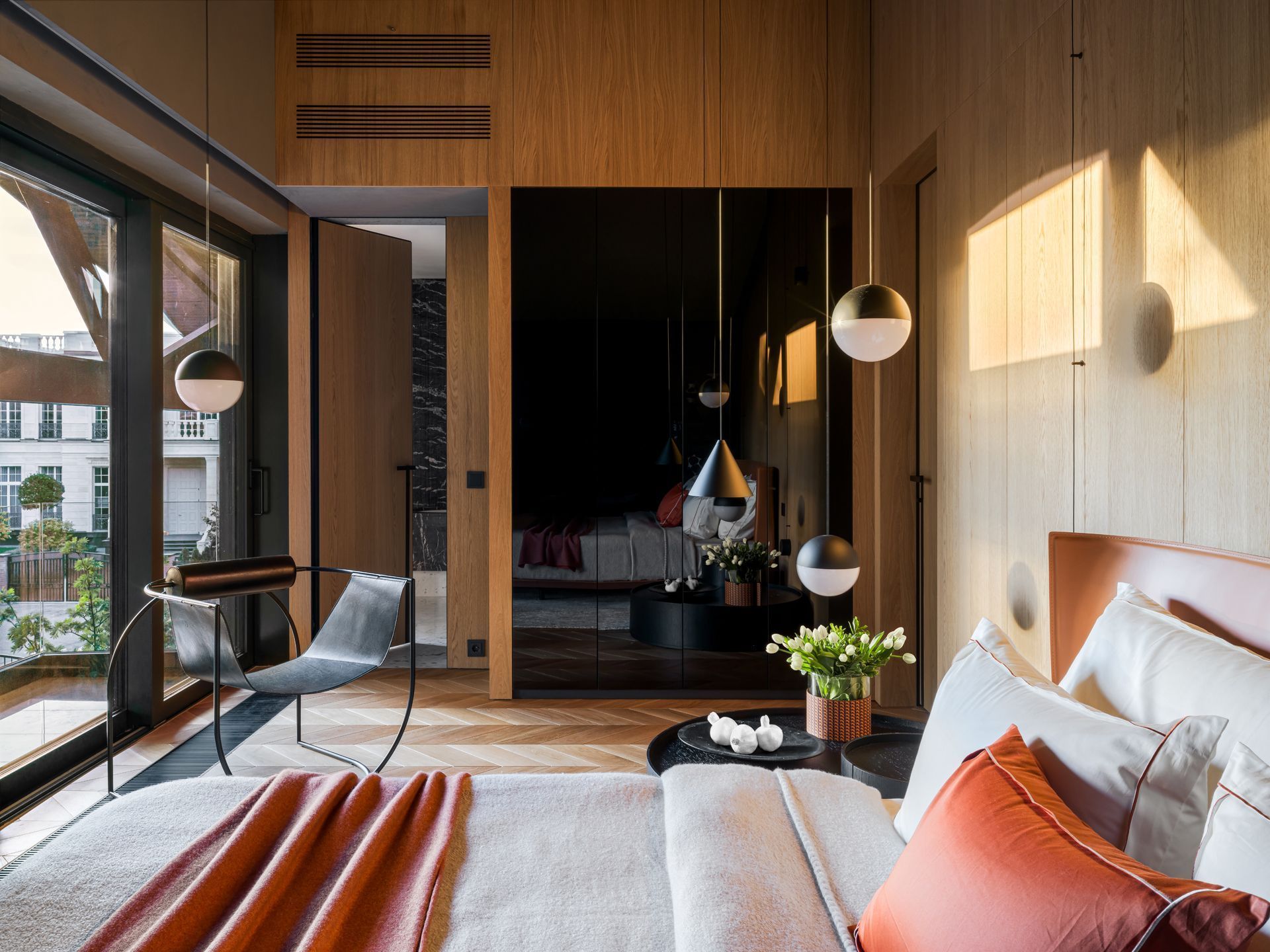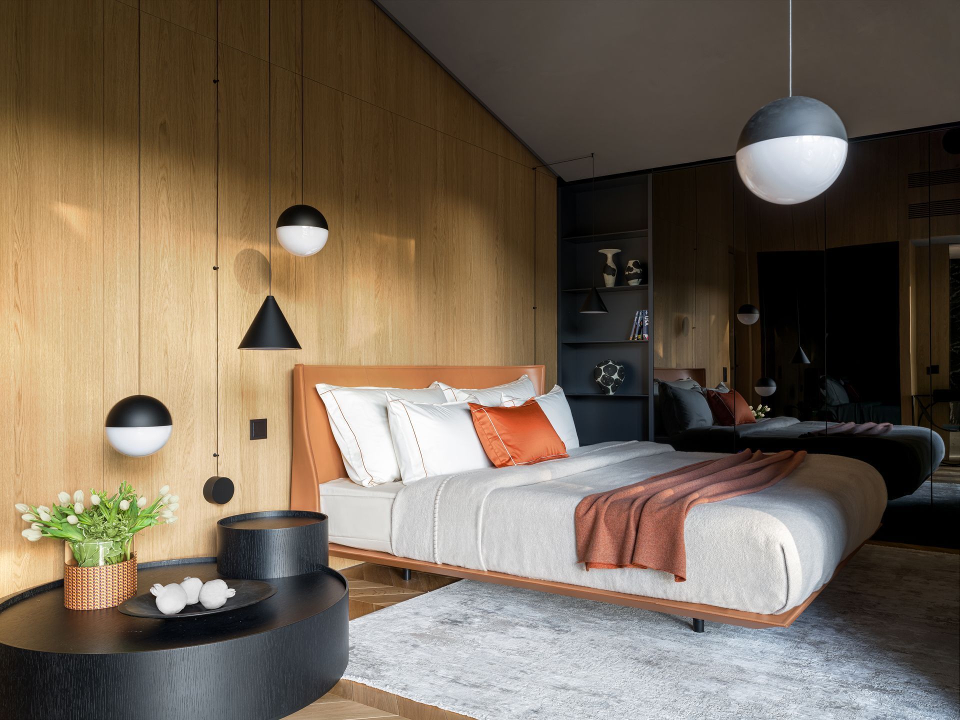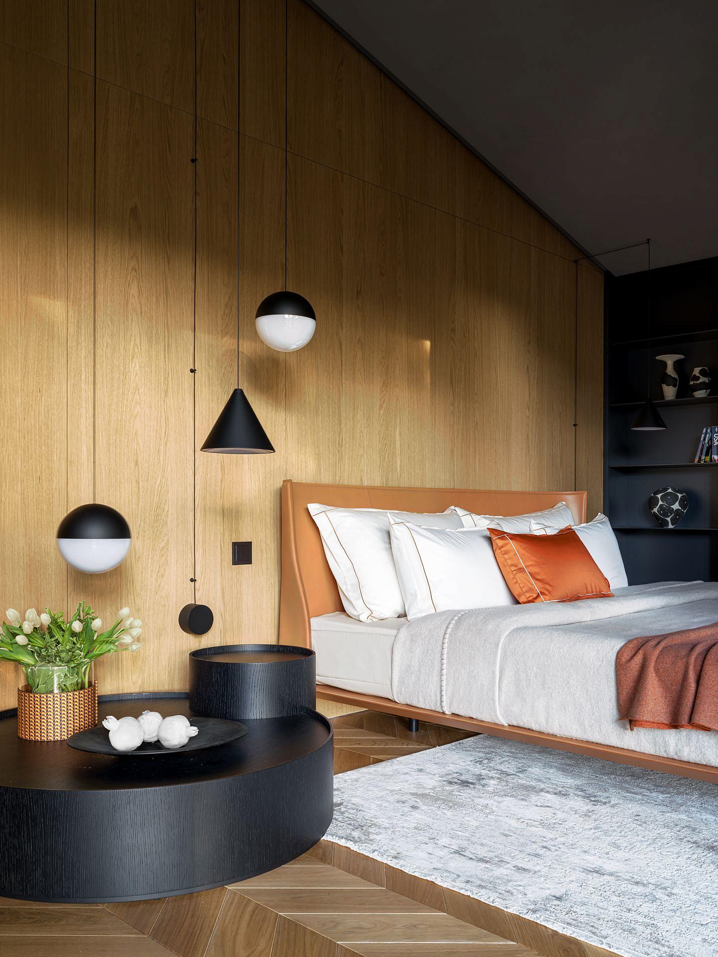 Минимализм и натуральные материалы. Подвесные световые системы Флос управляются прикосновением, их простые формы застыли в воздухе как снаряды невидимого циркового жонглера, соединительные кабели создают графику на потолке и стенах. Седельная кожа изголовья кровати сочетается с шерстяными тканями пледа Лоро Пиано. Линии легкого кресла напоминает гимнастическую трапецию, поддерживая общую спортивную тематику дома.