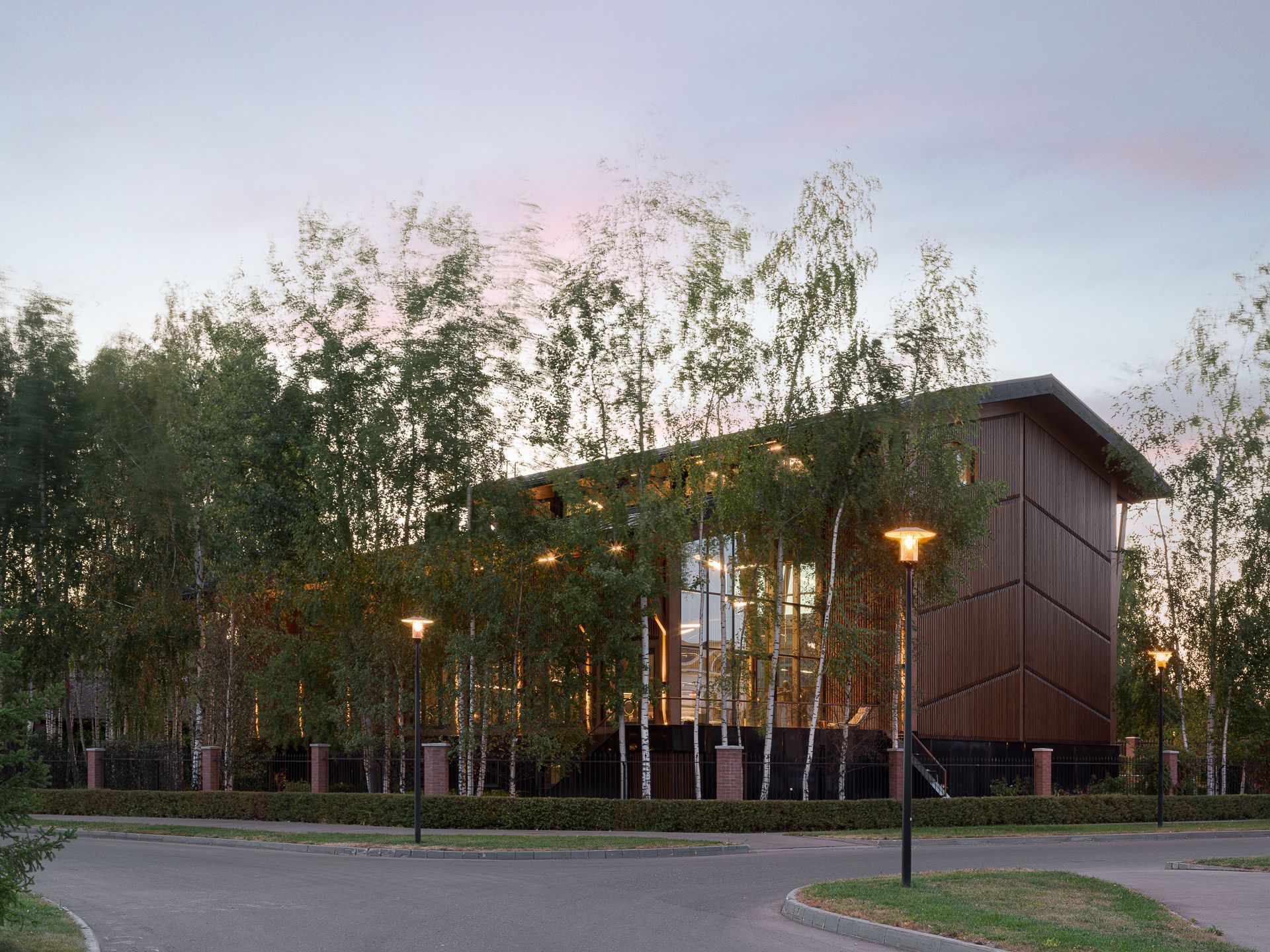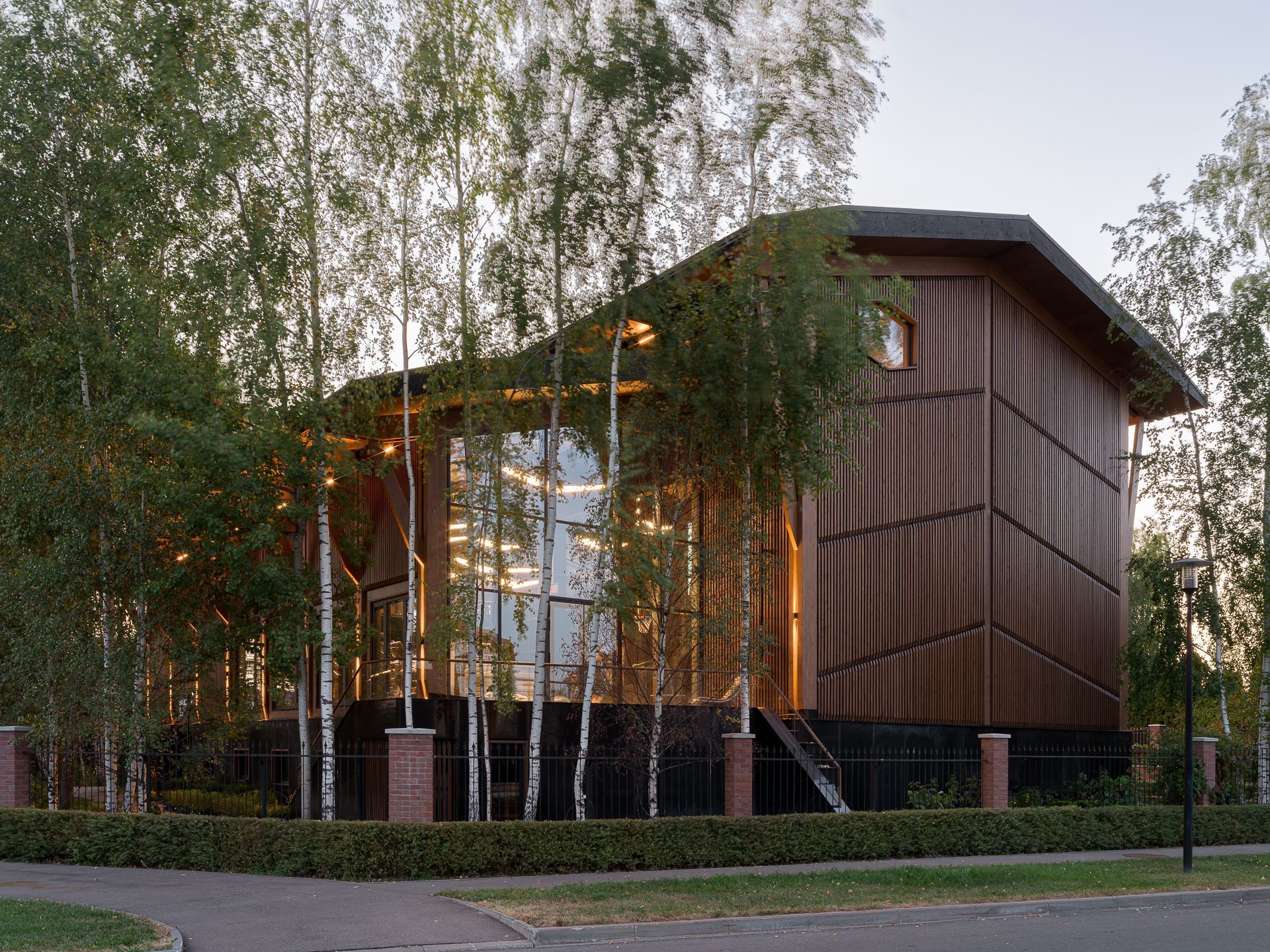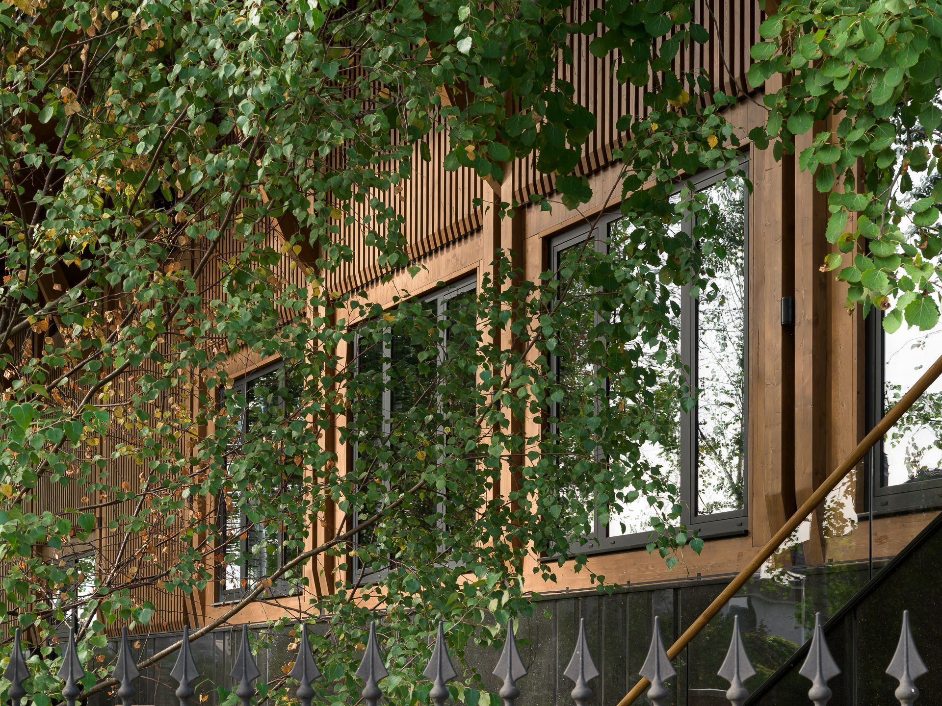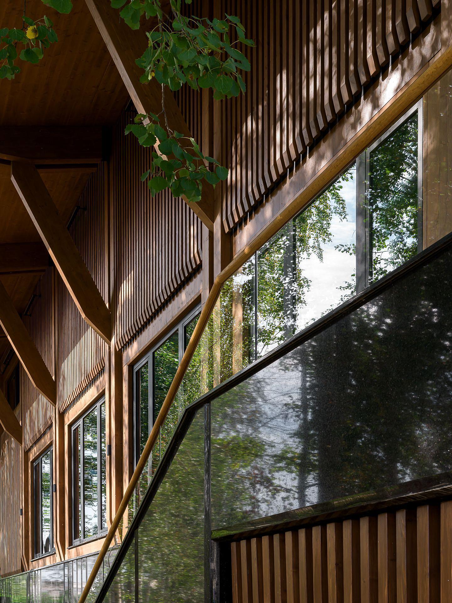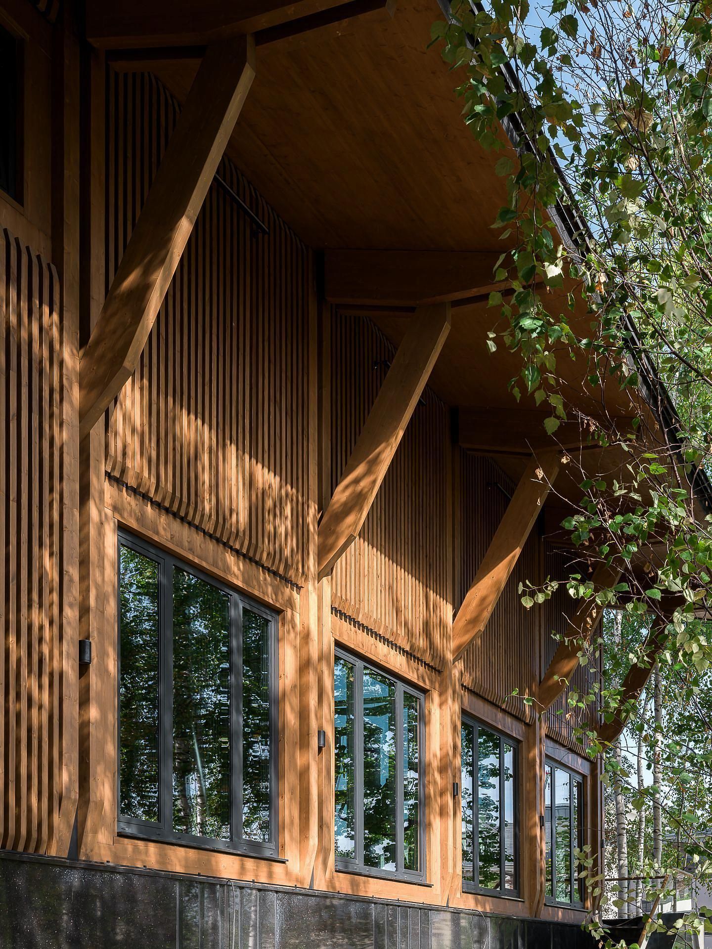 В двух кварталах от стройки мы организовали промежуточный цех: там фрезеровали, грунтовали и красили элементы фасада, а также внутренние панели. Максимум поверхностей в интерьере мы оставили без облицовки, открыв текстуру клеёной древесины.