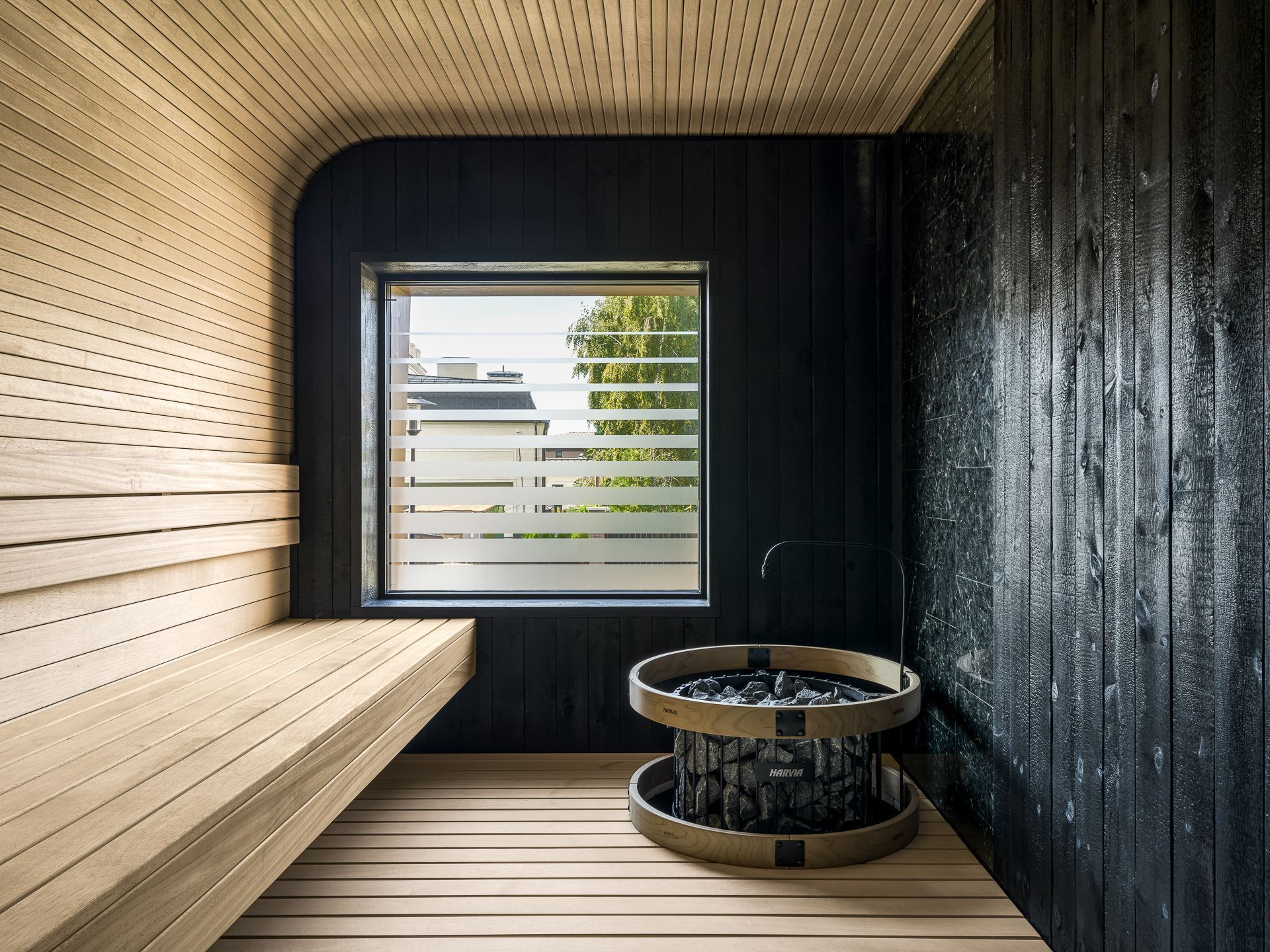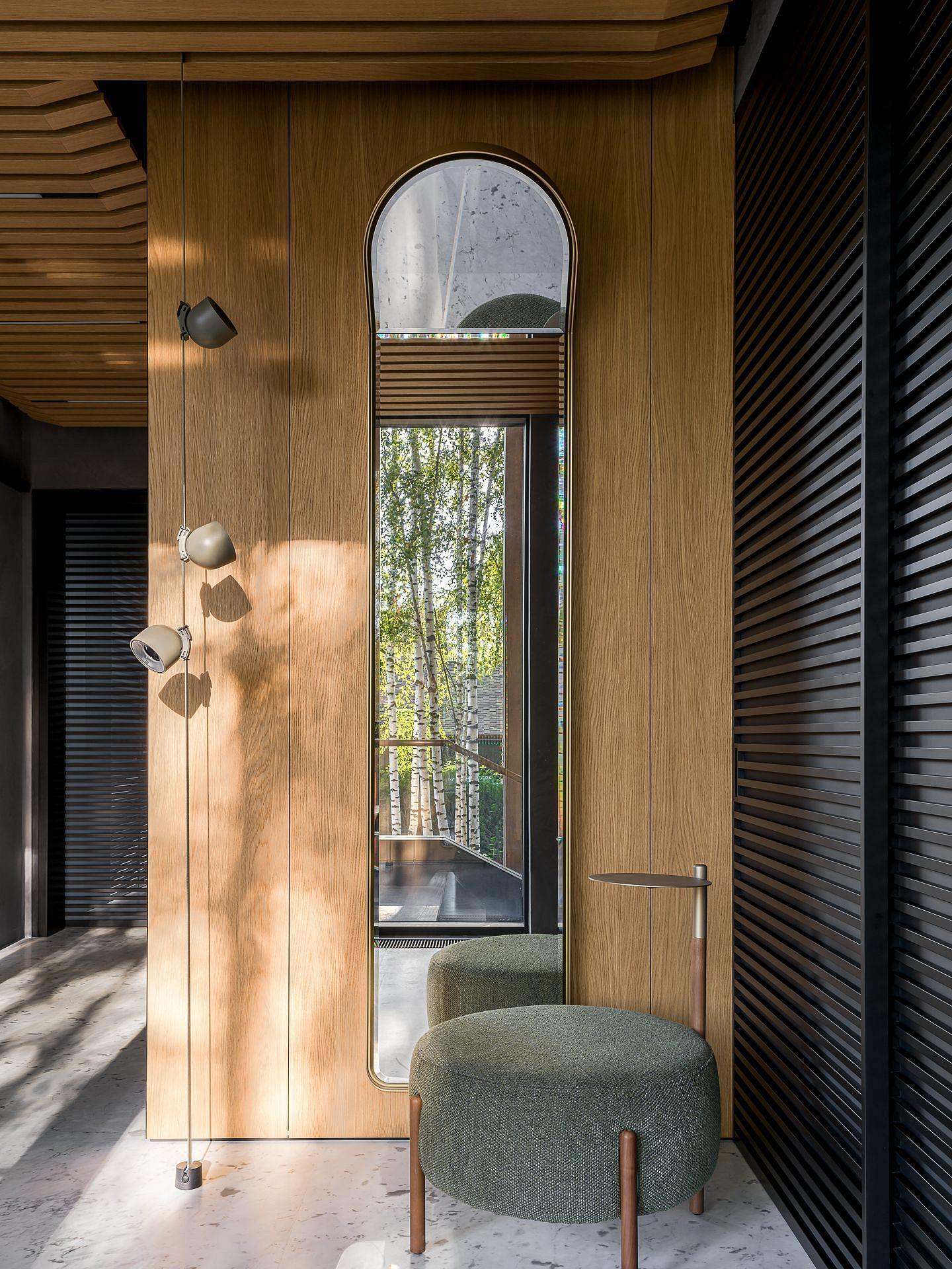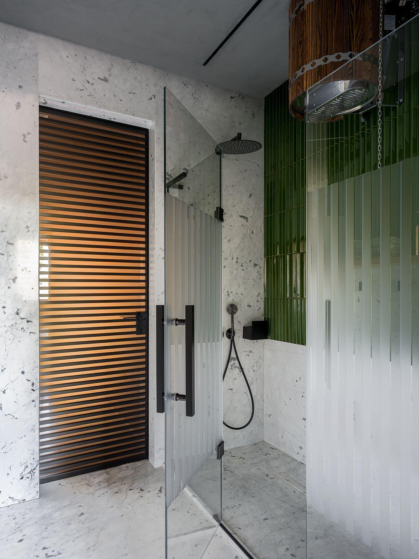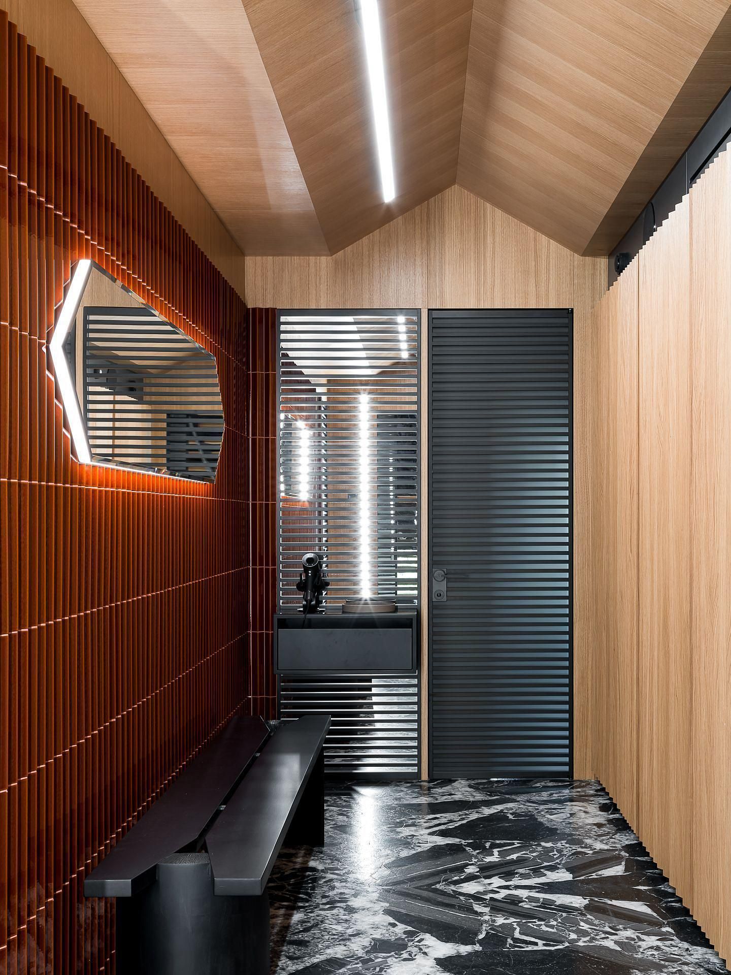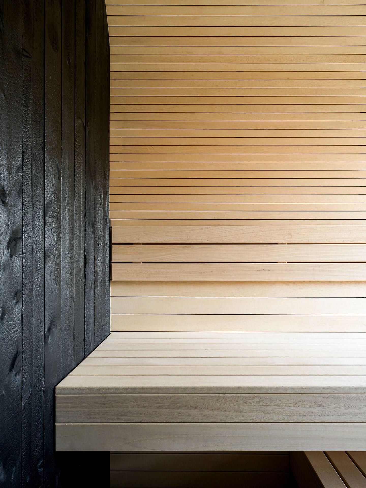 Сауна сочетает обожжённый сибирский кедр в технике японского Якисуги и африканский абаш — дерево с минимальной теплопроводностью, идеально подходящее для отделки зон, соприкасающихся с кожей.