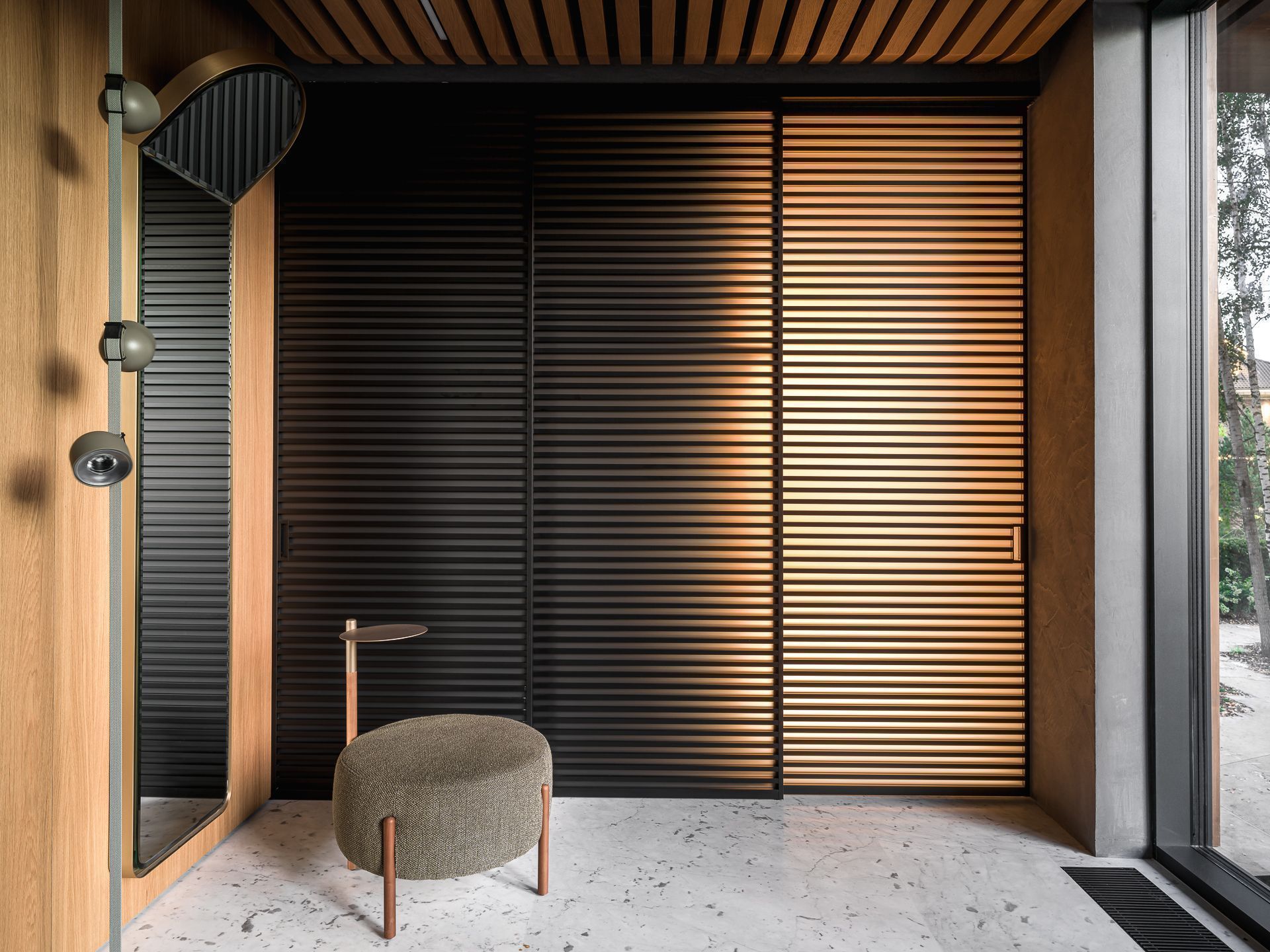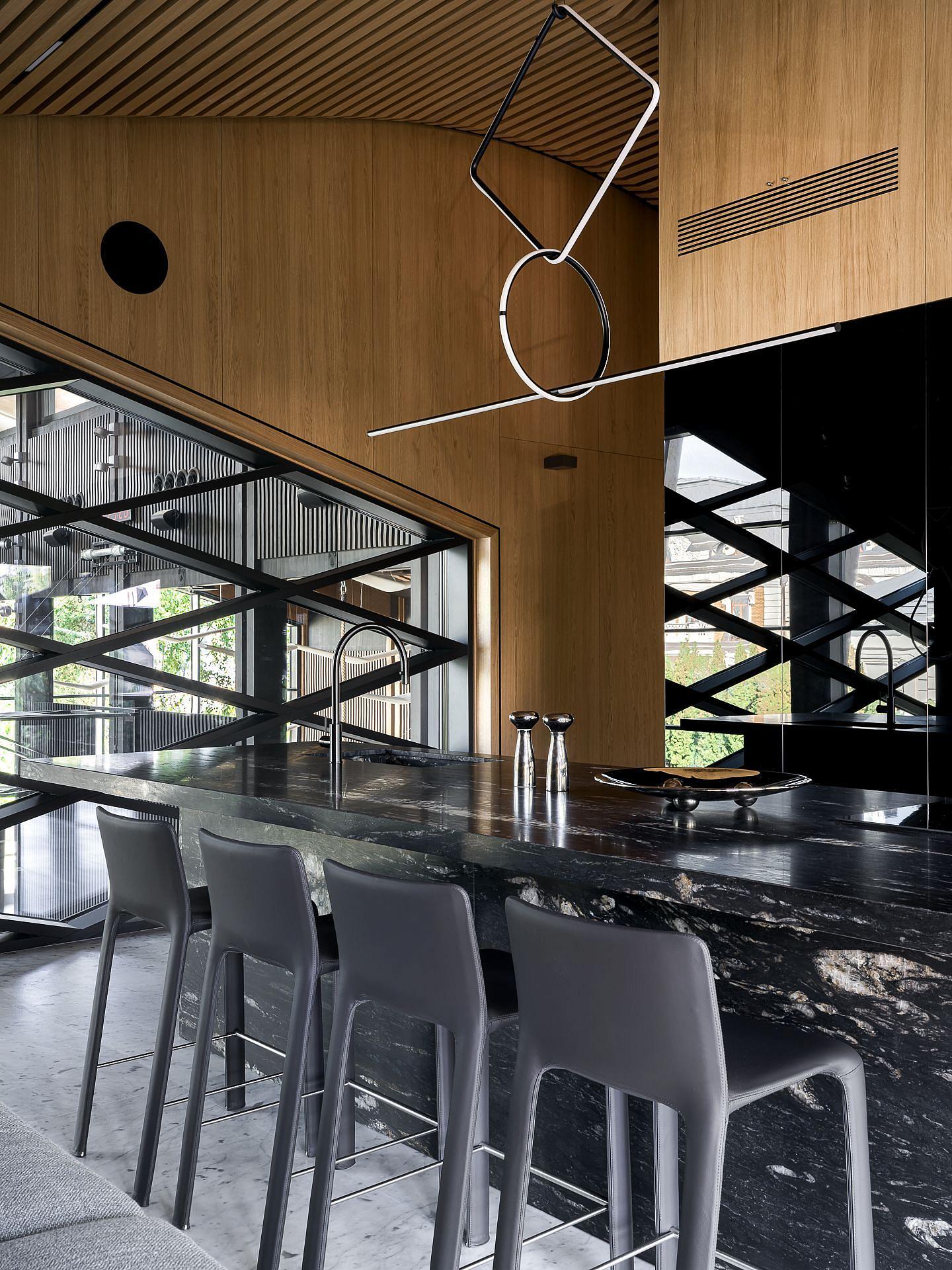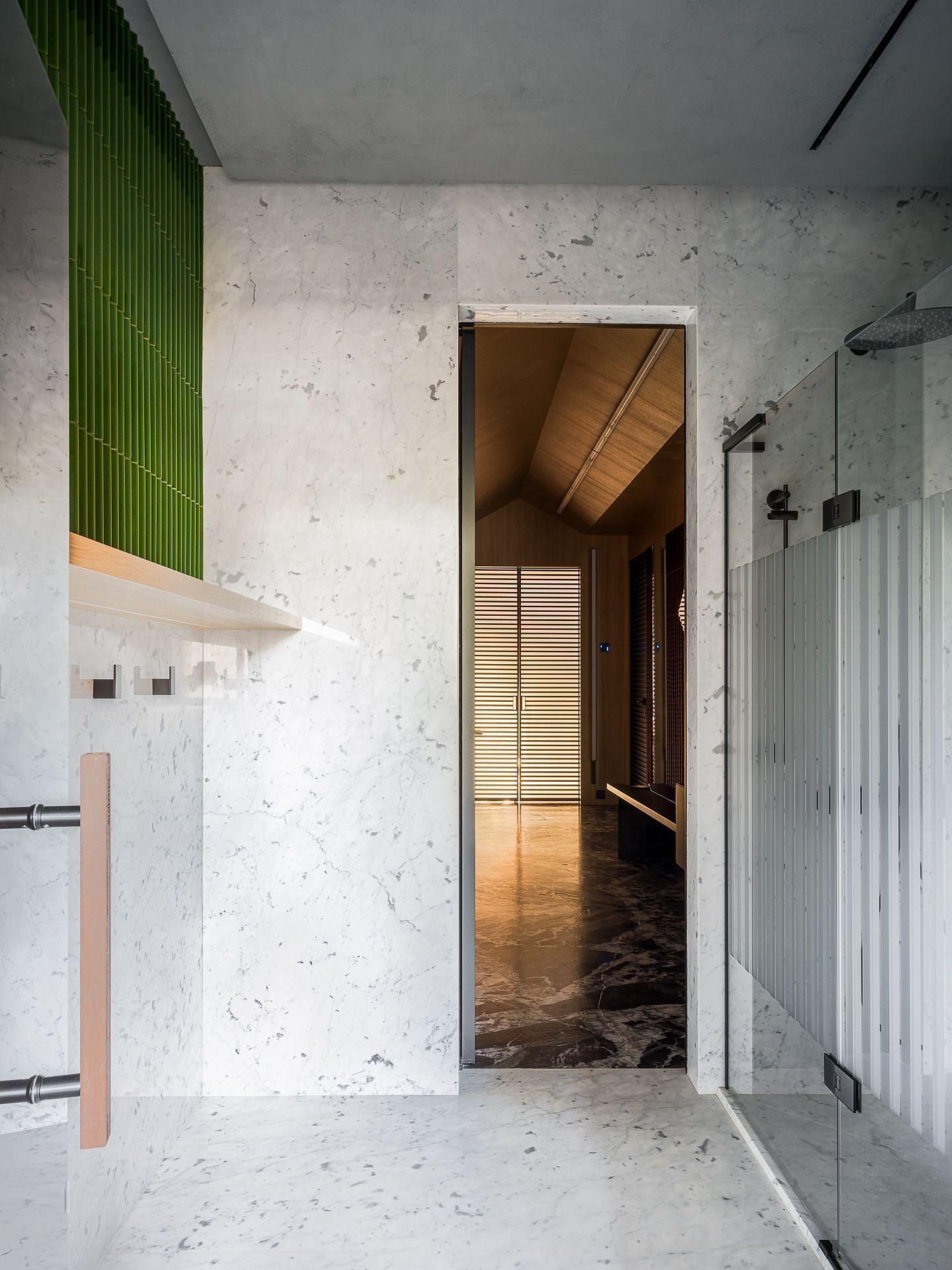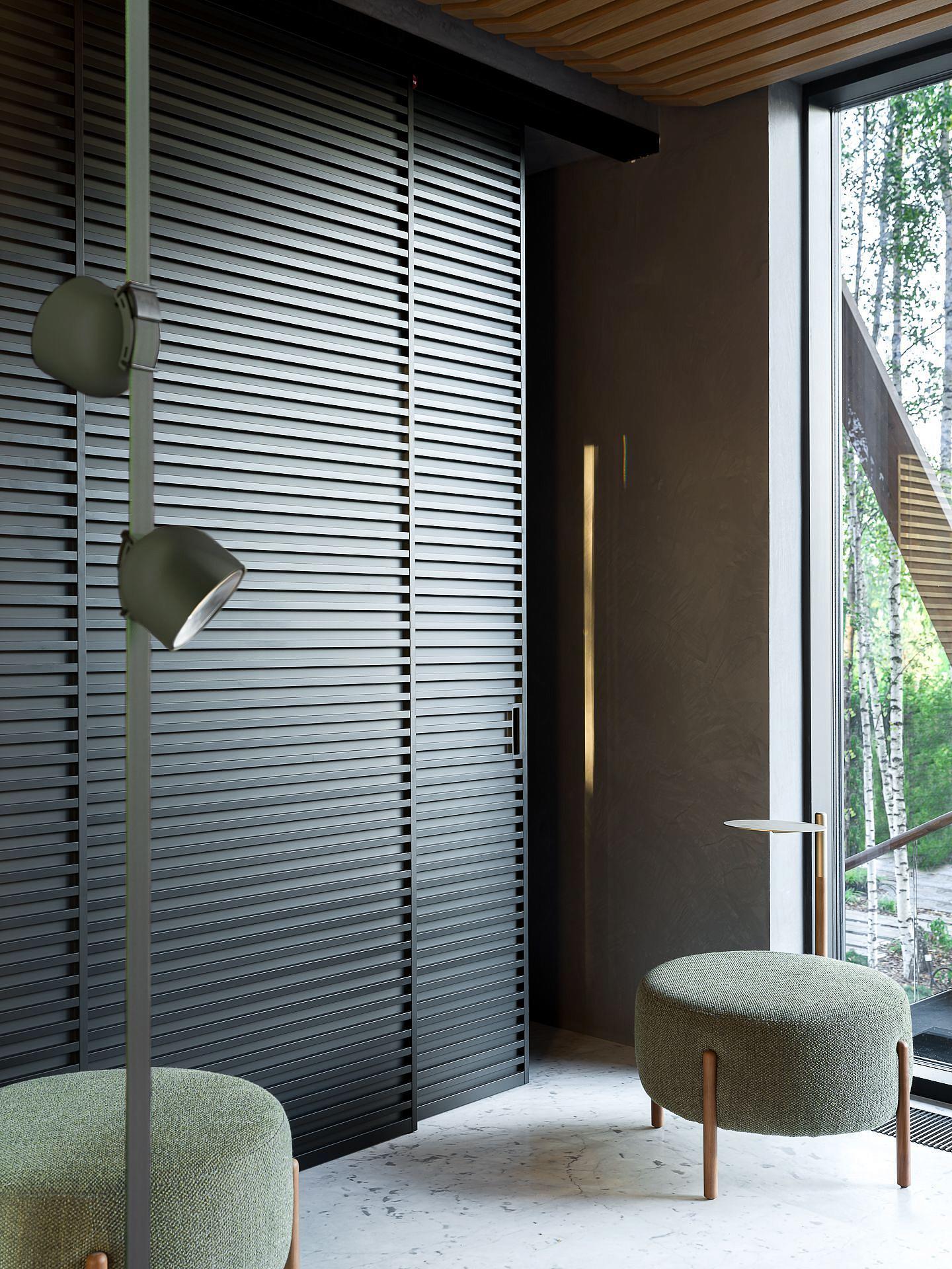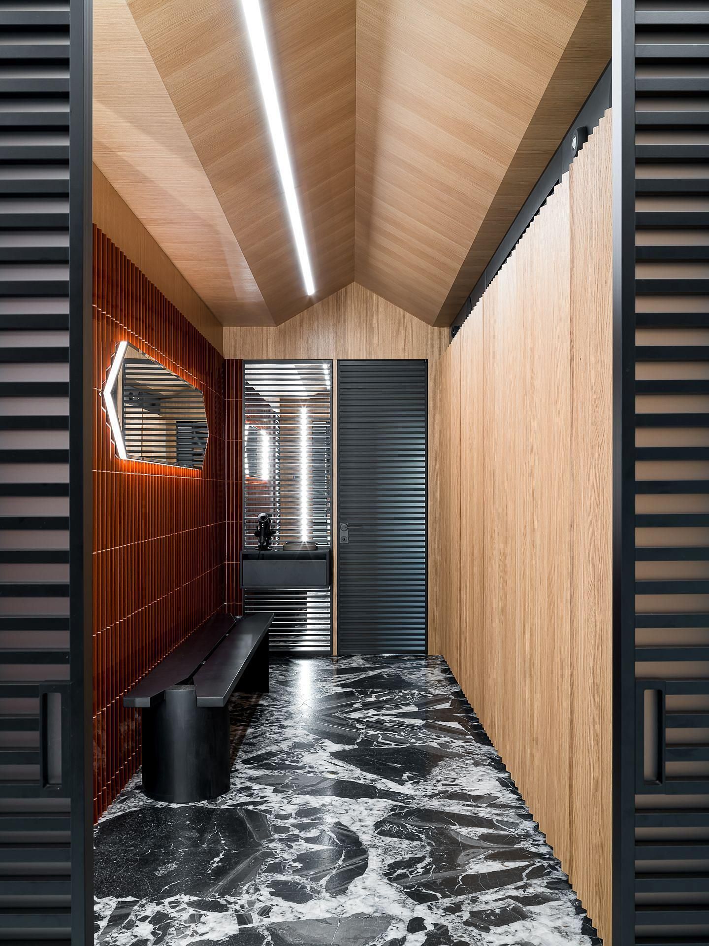 Сауна сочетает обожжённый сибирский кедр в технике японского Якисуги и африканский абаш — дерево с минимальной теплопроводностью, идеально подходящее для отделки зон, соприкасающихся с кожей.
