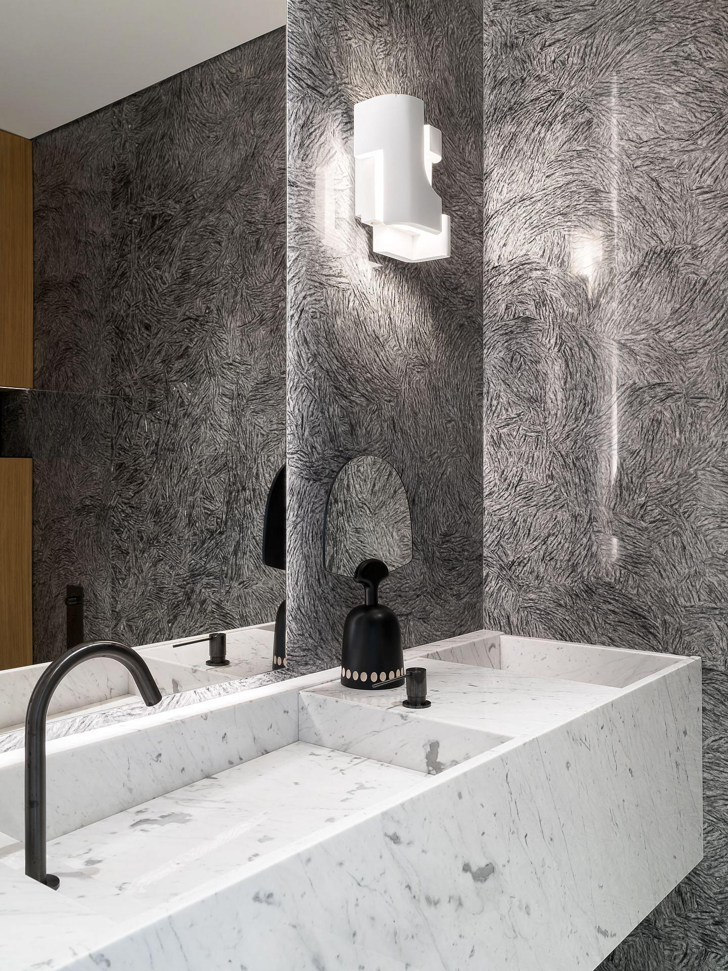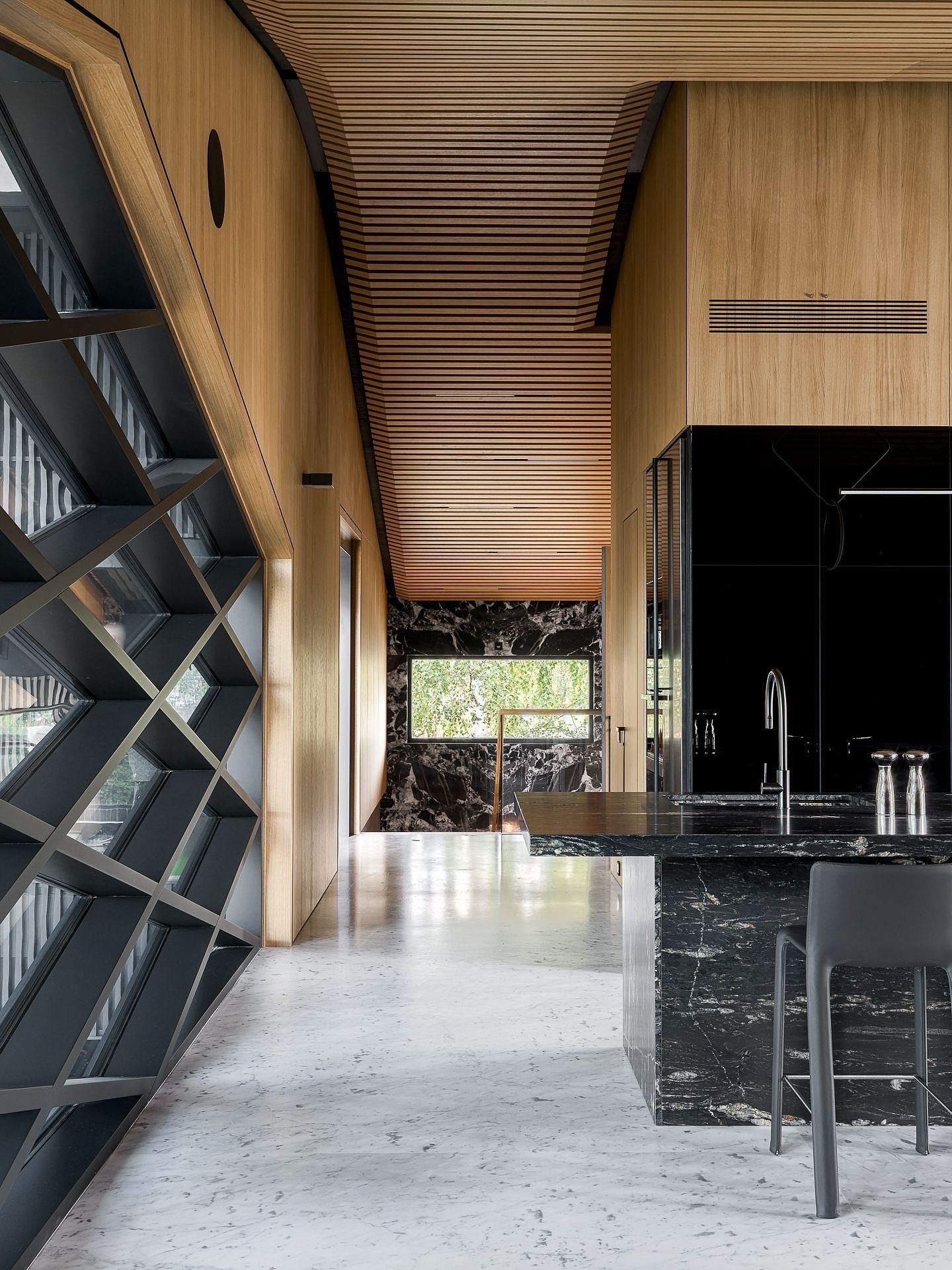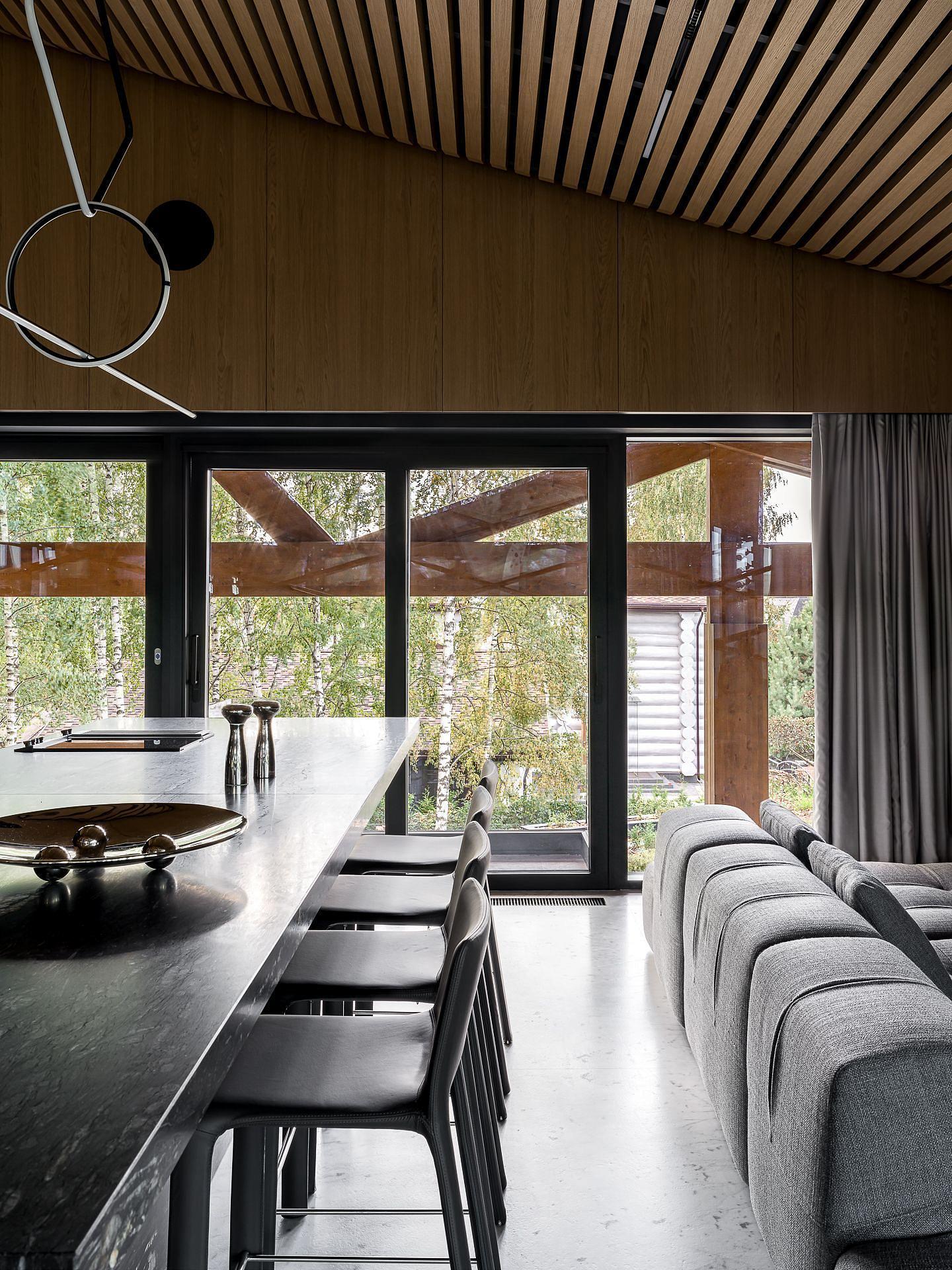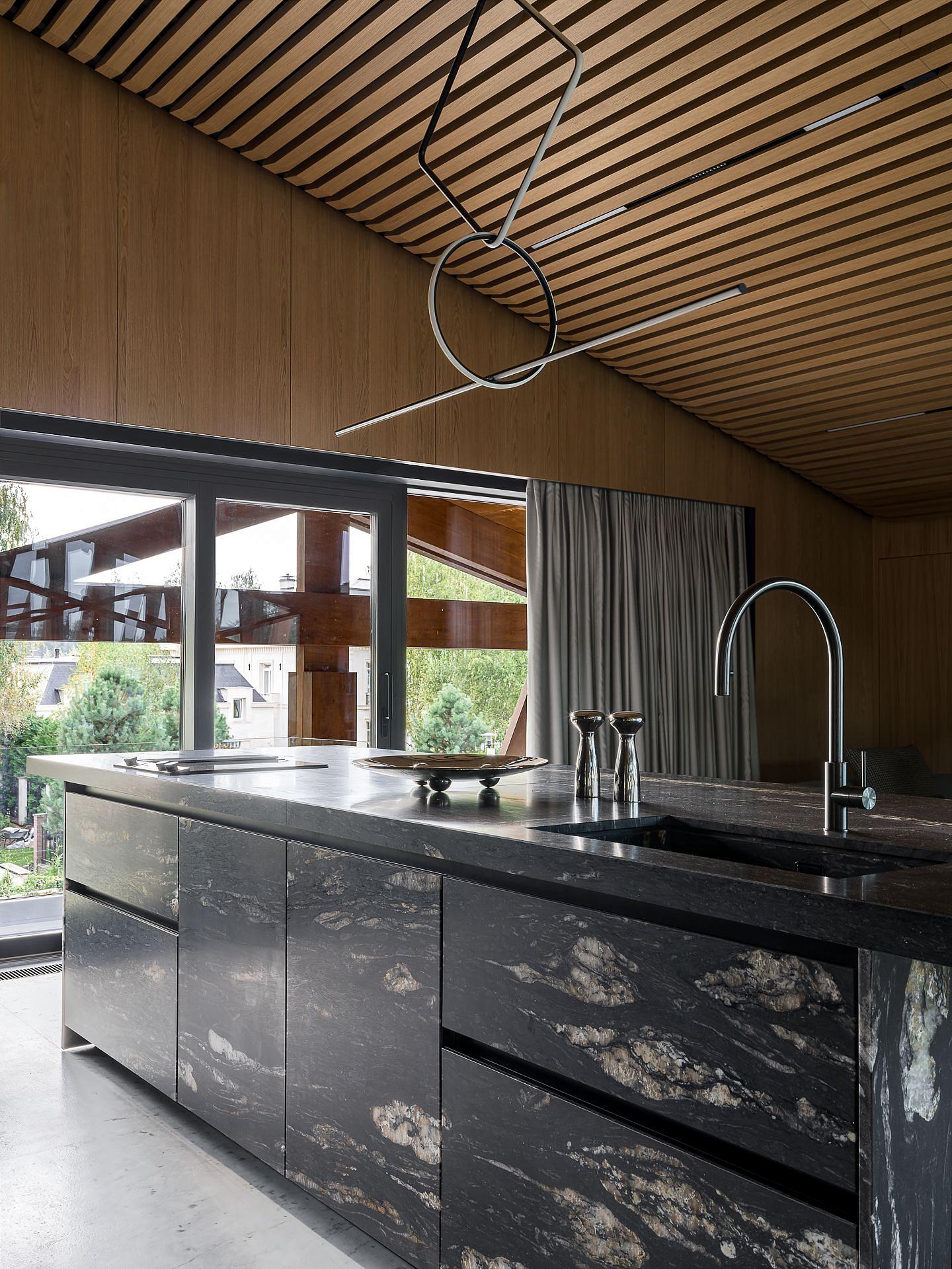 Сауна сочетает обожжённый сибирский кедр в технике японского Якисуги и африканский абаш — дерево с минимальной теплопроводностью, идеально подходящее для отделки зон, соприкасающихся с кожей.