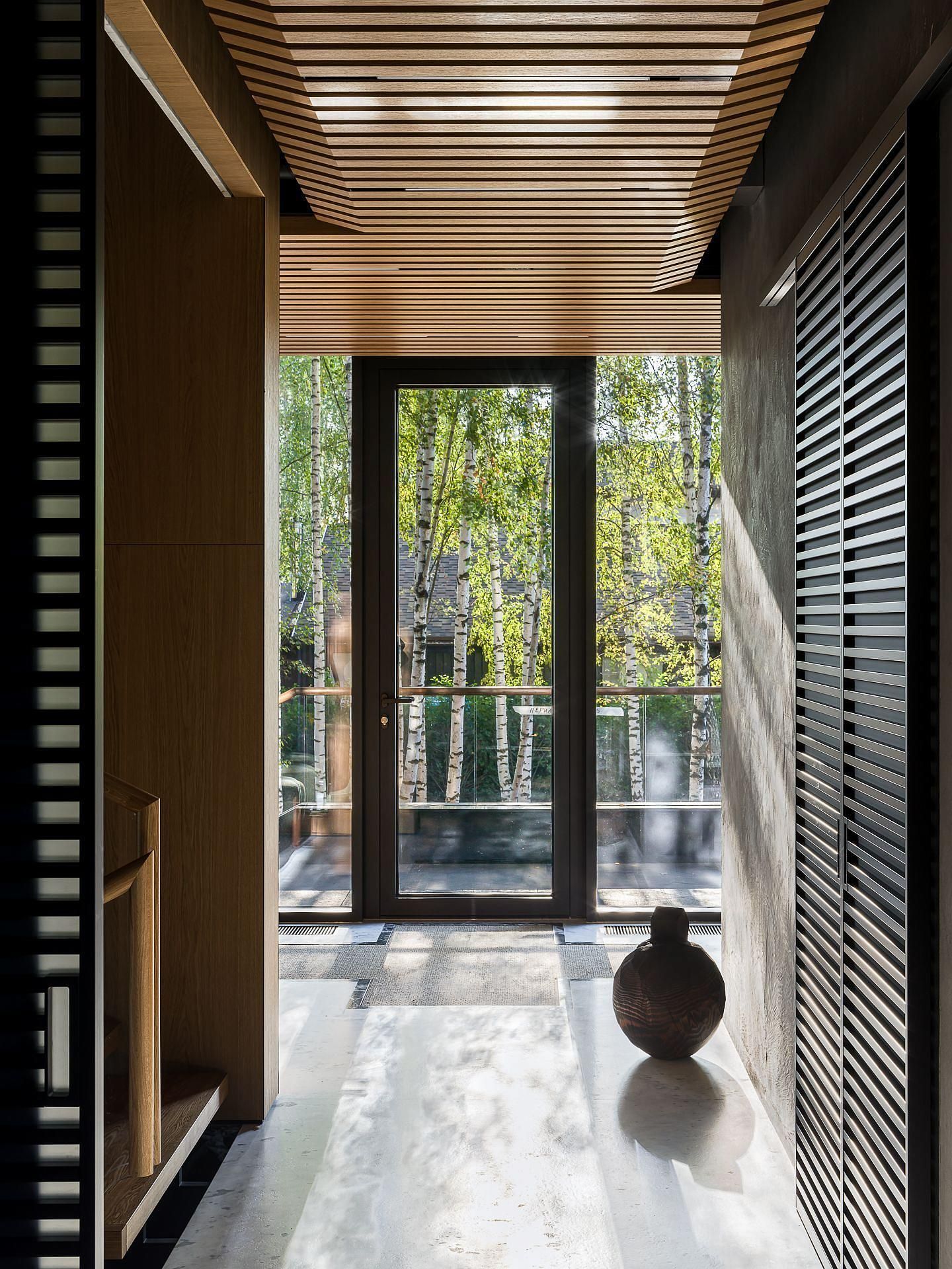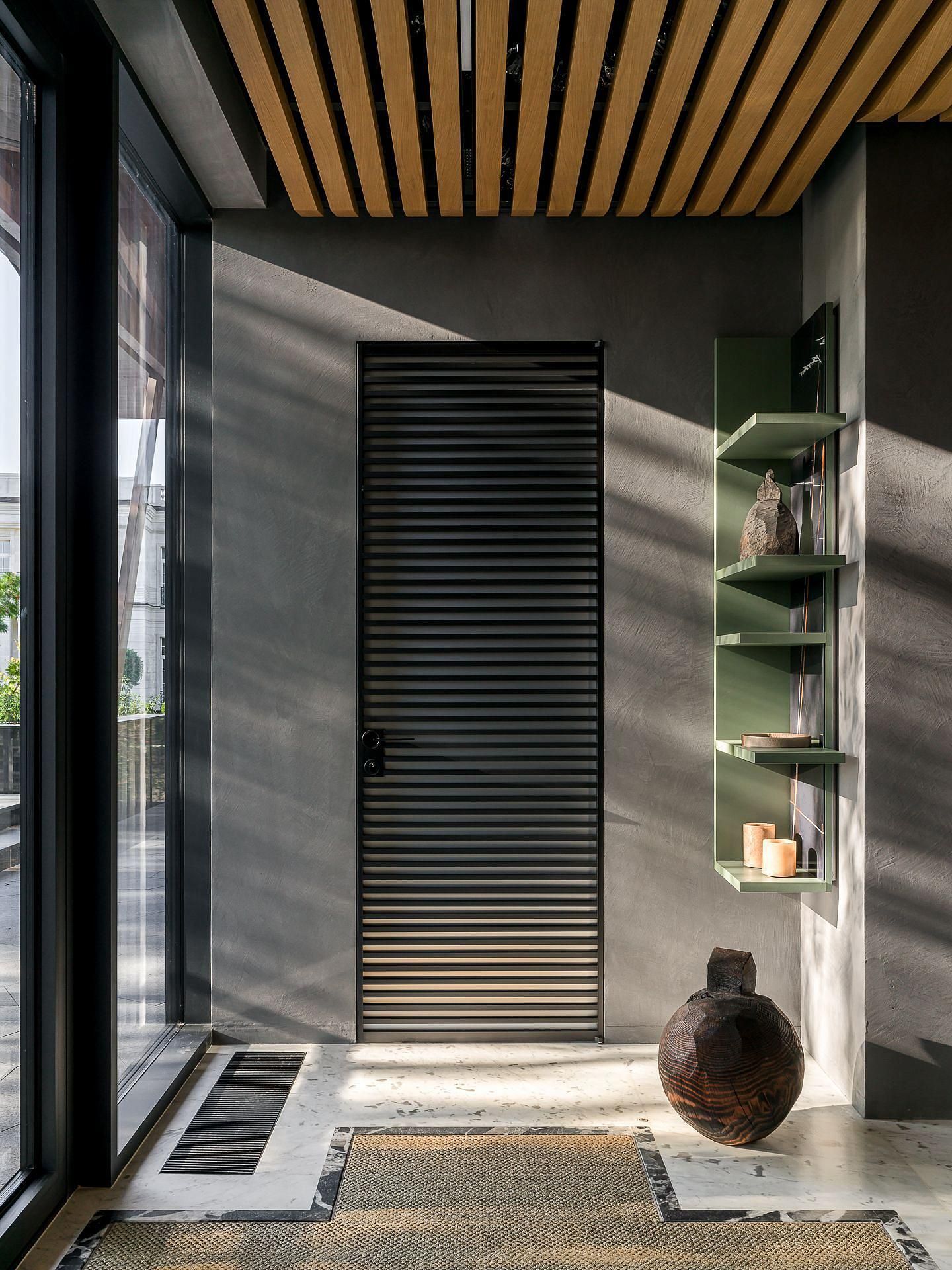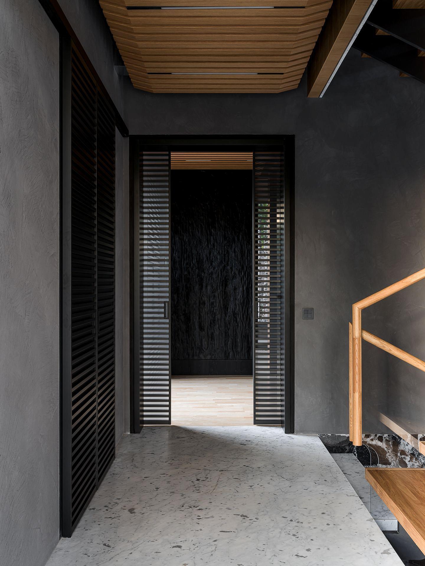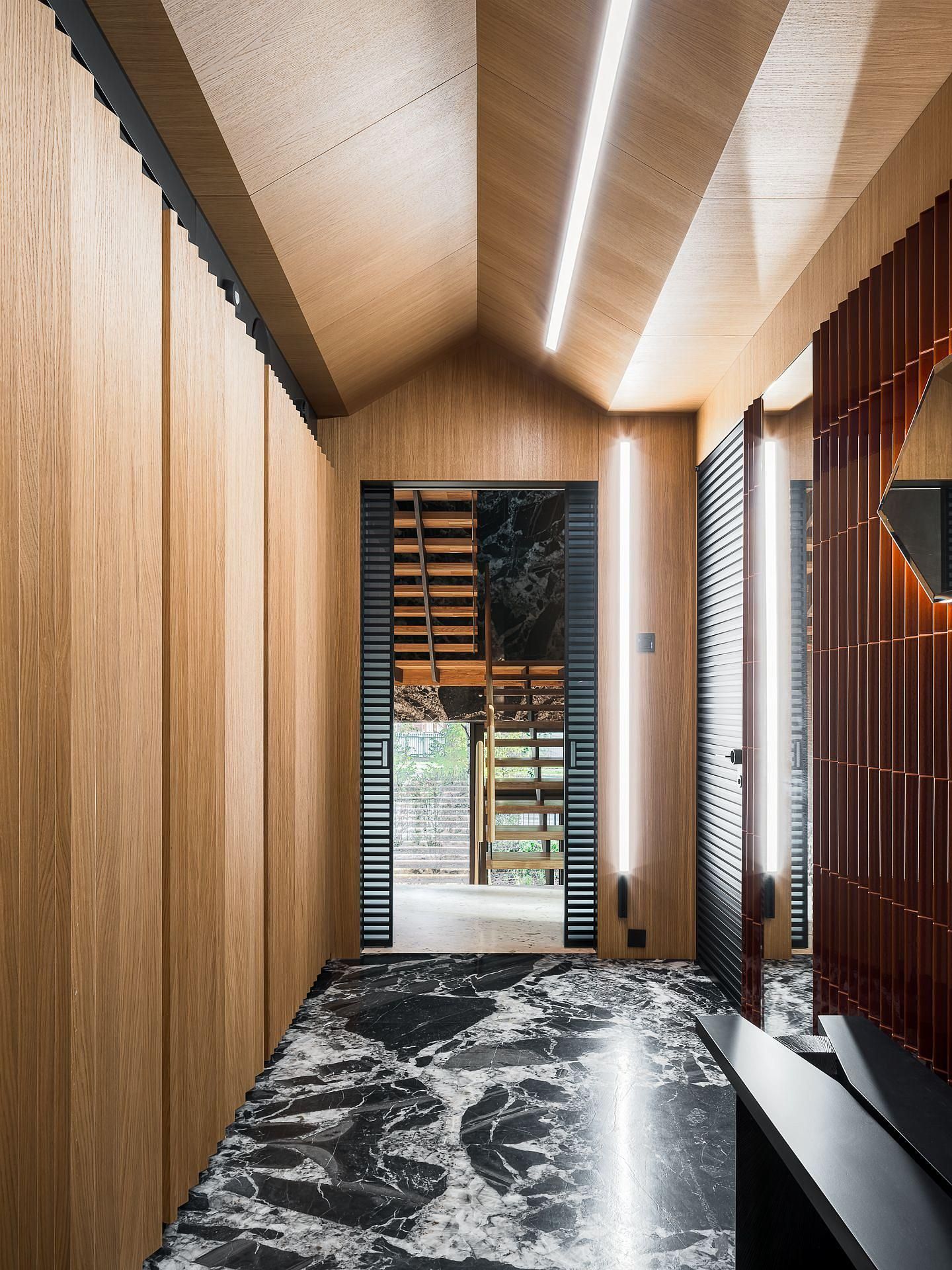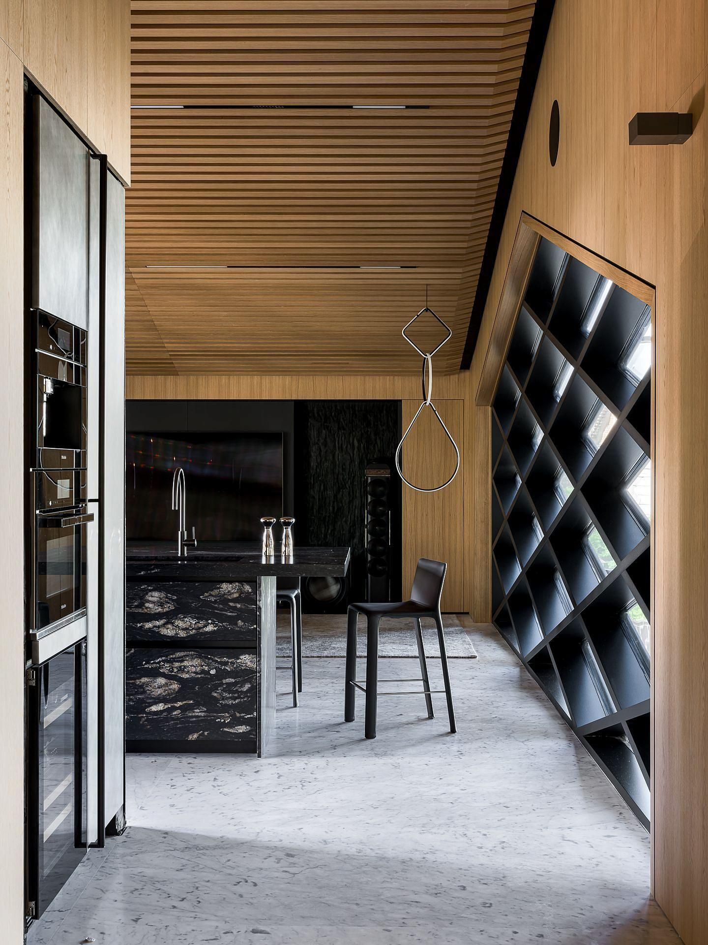 Сауна сочетает обожжённый сибирский кедр в технике японского Якисуги и африканский абаш — дерево с минимальной теплопроводностью, идеально подходящее для отделки зон, соприкасающихся с кожей.