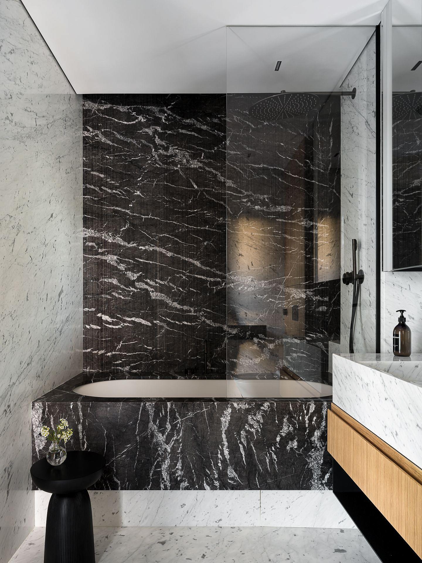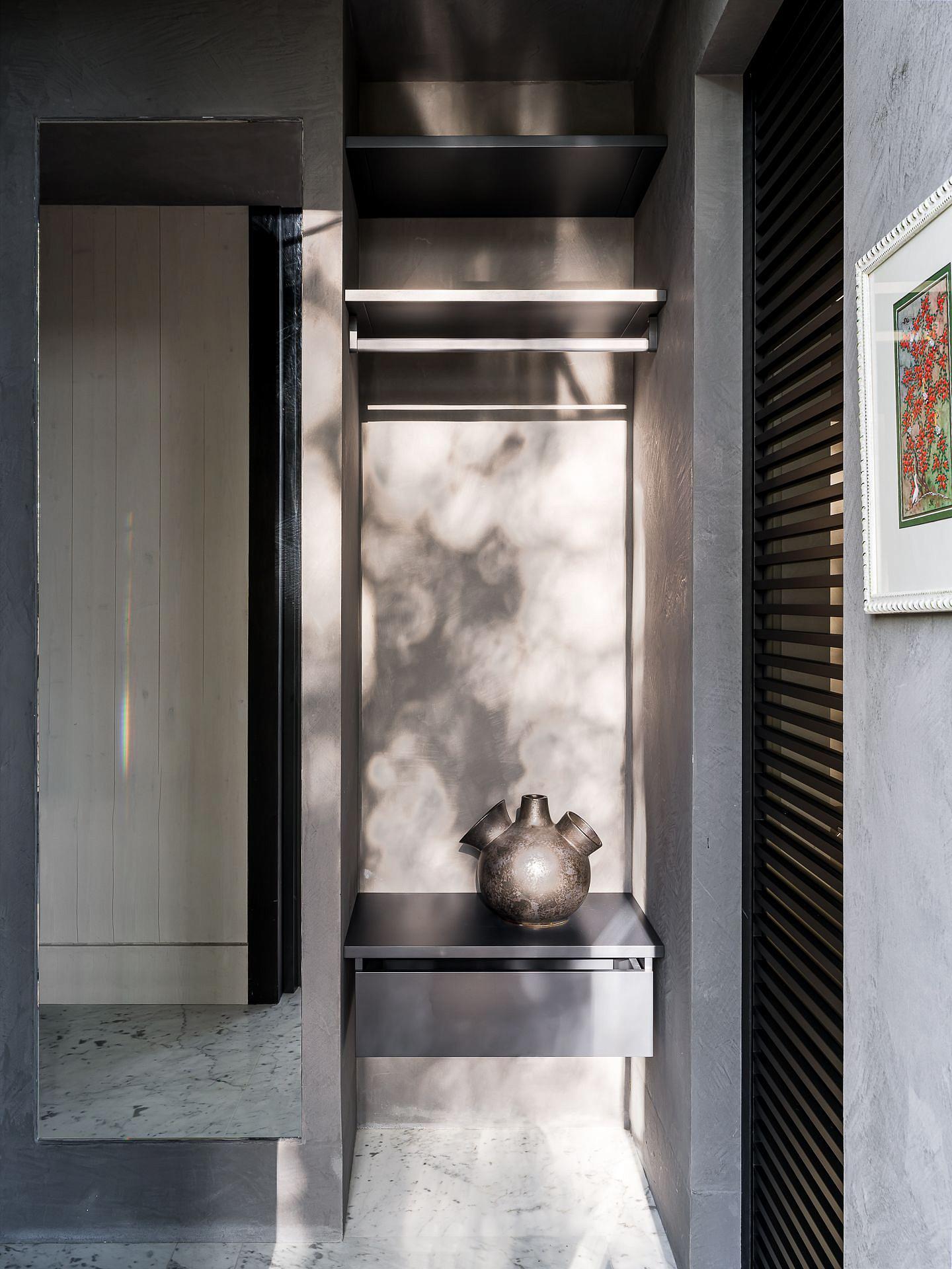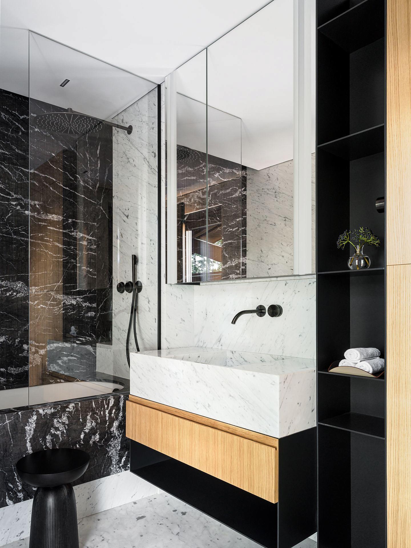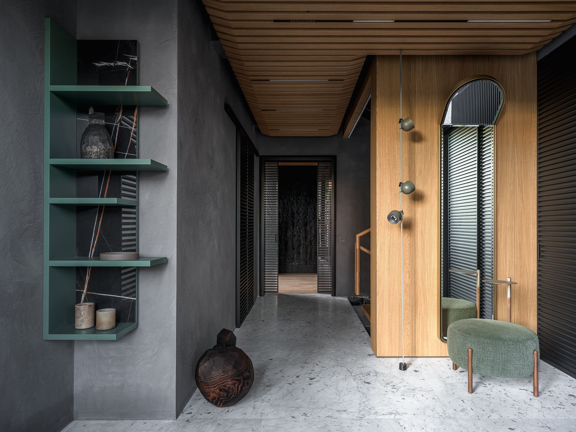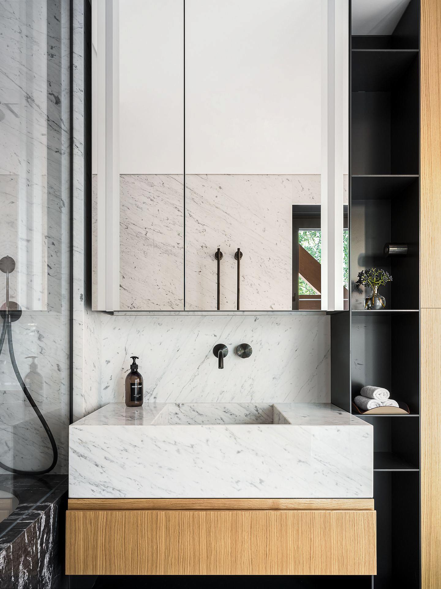 Сауна сочетает обожжённый сибирский кедр в технике японского Якисуги и африканский абаш — дерево с минимальной теплопроводностью, идеально подходящее для отделки зон, соприкасающихся с кожей.