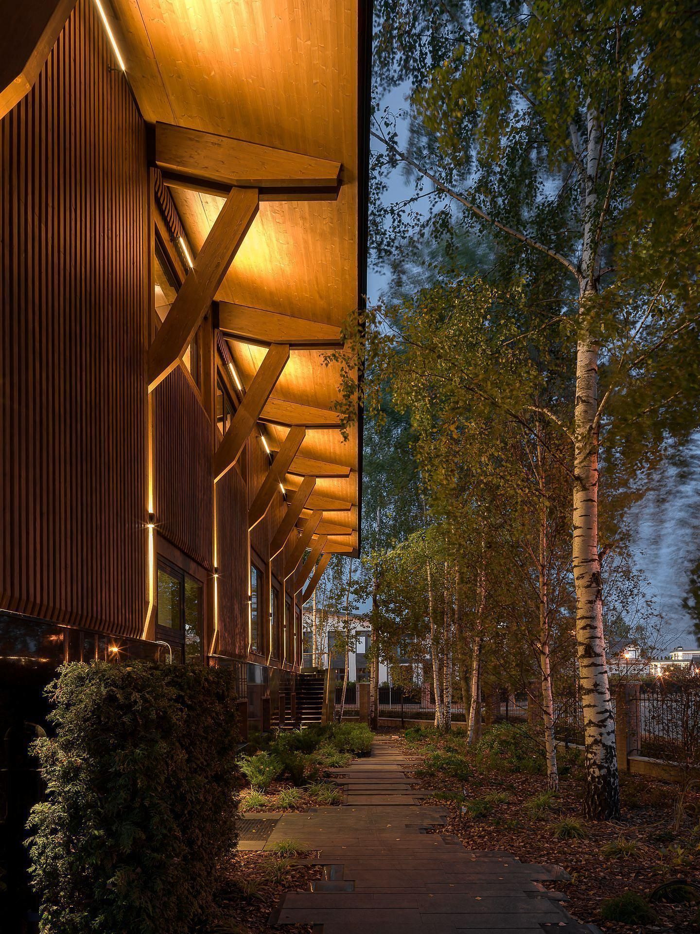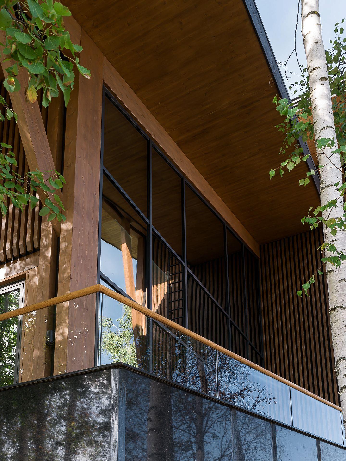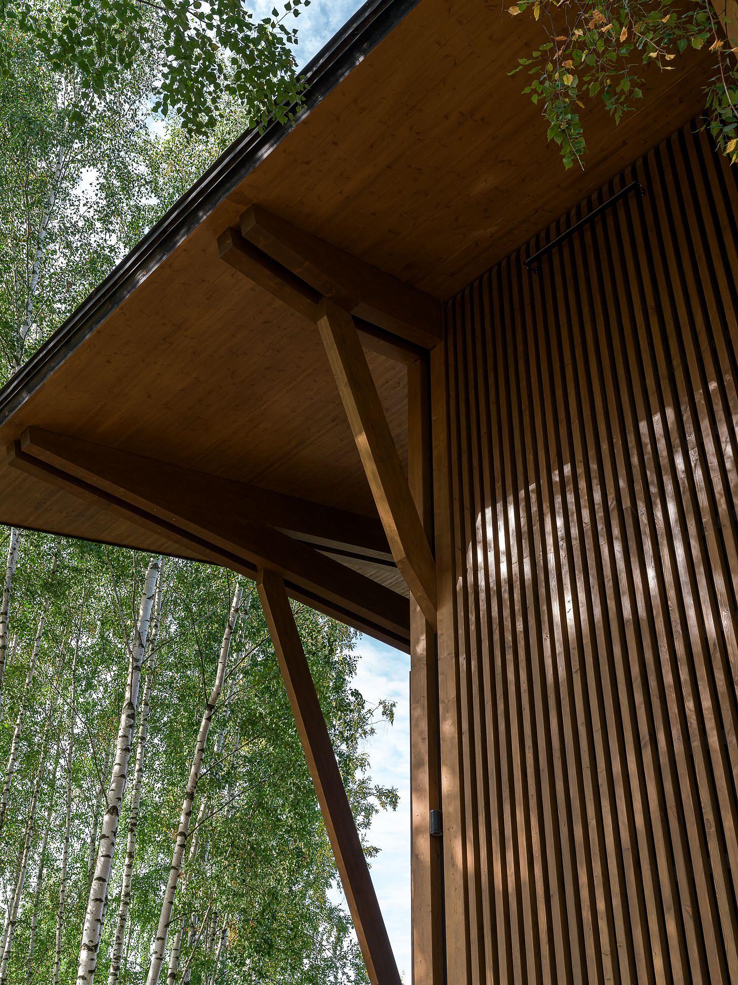 Пока на участке строился железобетонный цоколь, на заводе шла сборка верхней части дома из крупноформатных CLT-панелей. Этот материал — прочный, сейсмоустойчивый, негорючий и экологичный. Наружные стены толщиной 240 мм не требуют утеплителя и исключают конденсат. Вентилируемый фасад из термоберёзы не только защищает, но и подчёркивает масштаб объёма.
