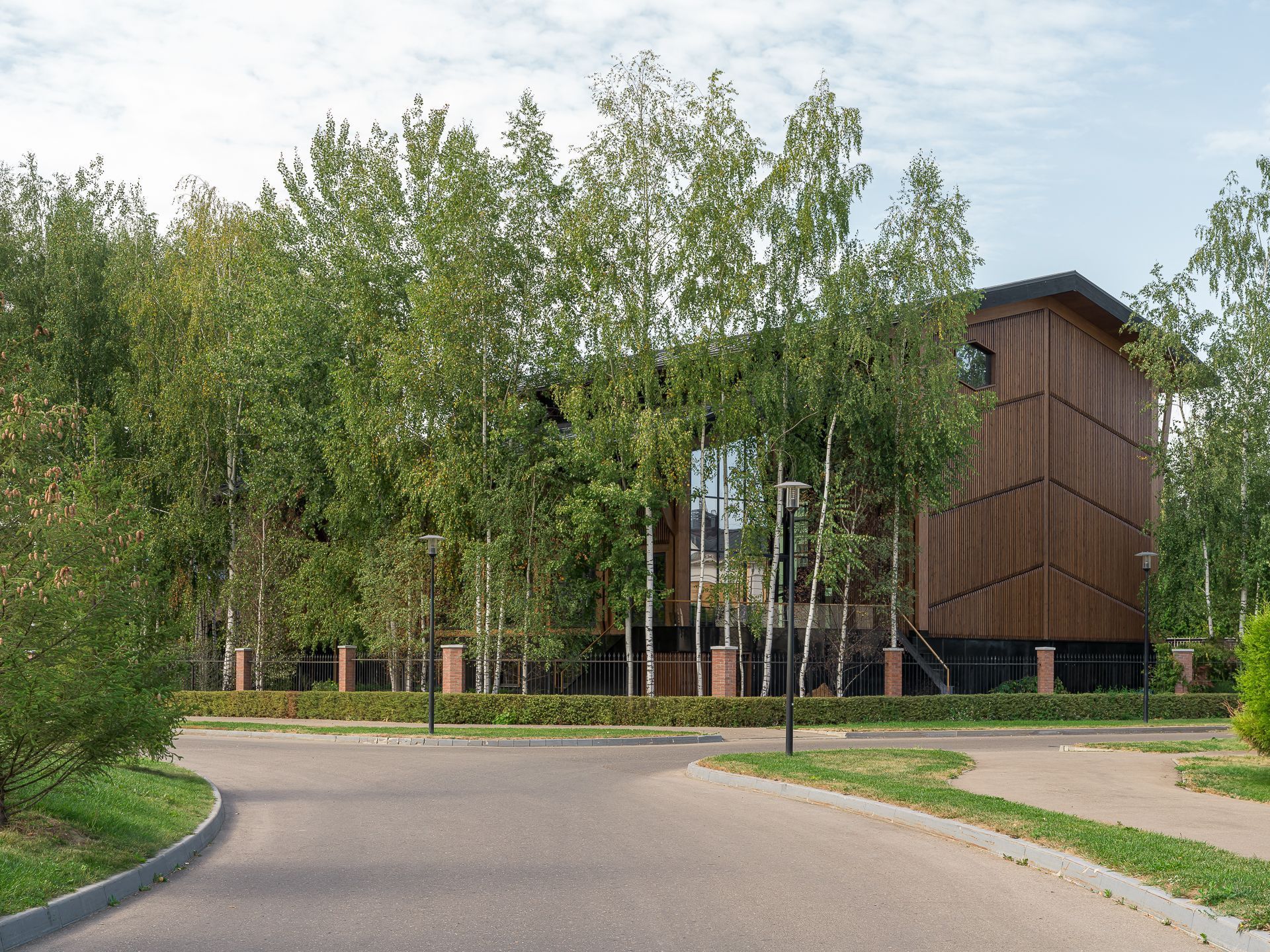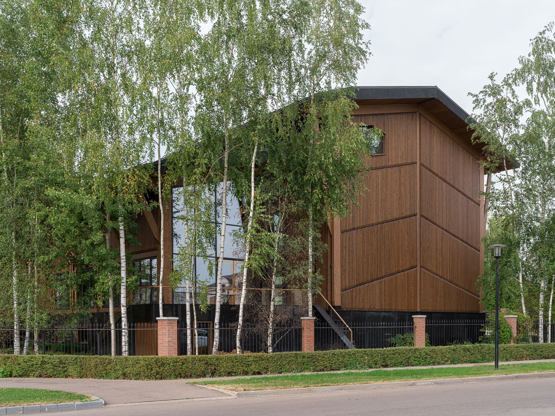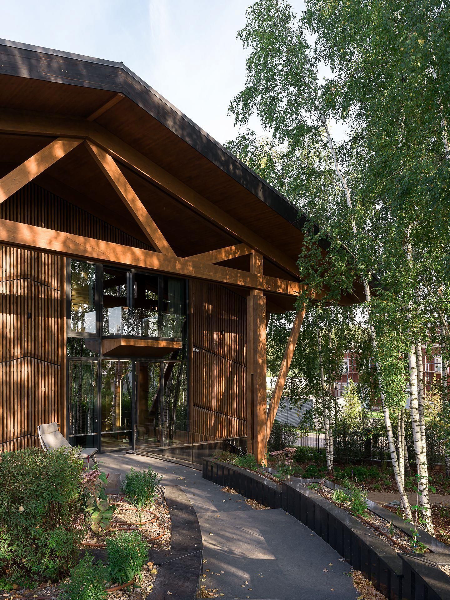 Пока на участке строился железобетонный цоколь, на заводе шла сборка верхней части дома из крупноформатных CLT-панелей. Этот материал — прочный, сейсмоустойчивый, негорючий и экологичный. Наружные стены толщиной 240 мм не требуют утеплителя и исключают конденсат. Вентилируемый фасад из термоберёзы не только защищает, но и подчёркивает масштаб объёма.