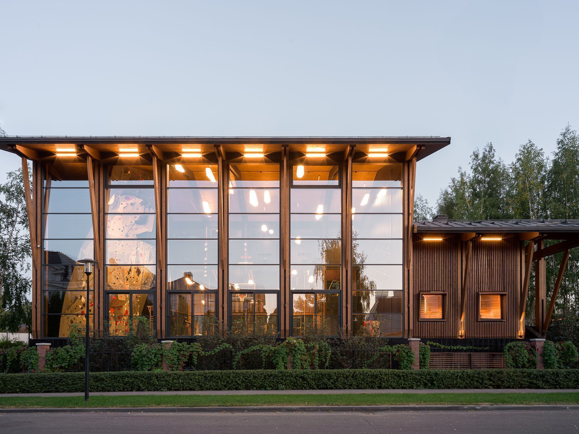 Проектная работа шла параллельно строительству — риск, возможный только при полном доверии заказчика. Уже через неделю после согласования концепции на площадке начали разрабатывать котлован, хотя детальные чертежи железобетона ещё были в работе. Через 12 месяцев заказчики получили готовый спортивный зал; ещё полгода ушло на менее срочную вторую очередь — гостиную, спальни, сауну и зону персонала.