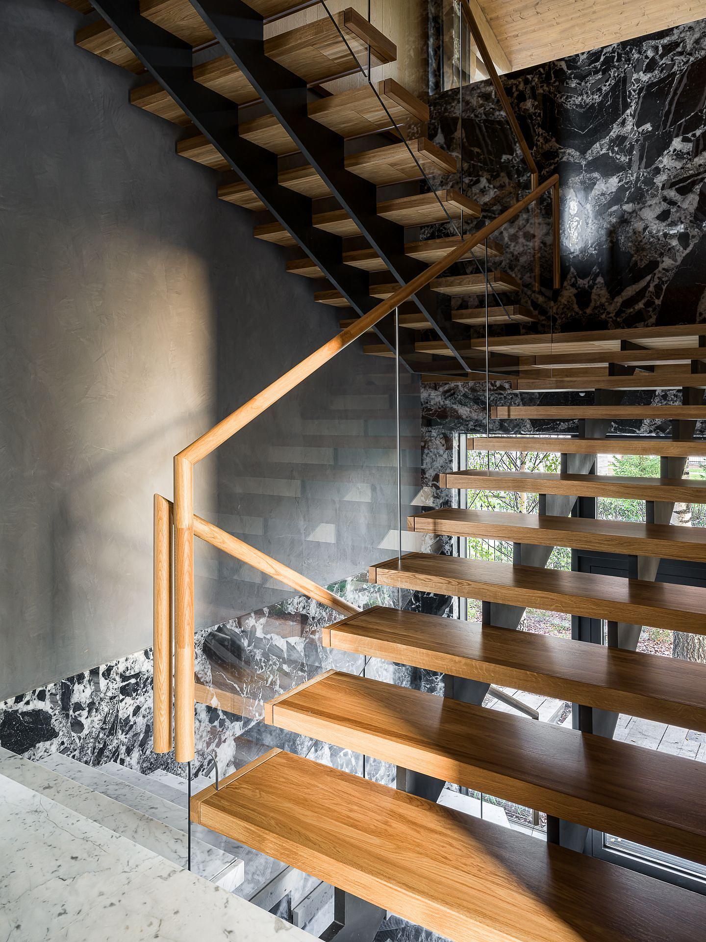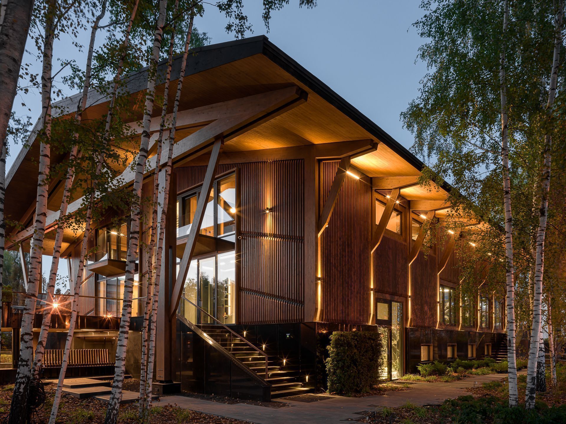 Мы работаем в сегменте премиум класса, где ценится честность материалов. СЛТ без облицовки демонстрирует красоту ели. Акцентная резьба по несущим панелям формирует эстетику, где сочетаются дорогие и простые решения: микроцемент и каррарский мрамор, обожжённый сибирский кедр и абаш. Скульптура-скалодром из фанеры с живым полипово-молюсковым слоем и вариативностью трасс стала центром интерьера.