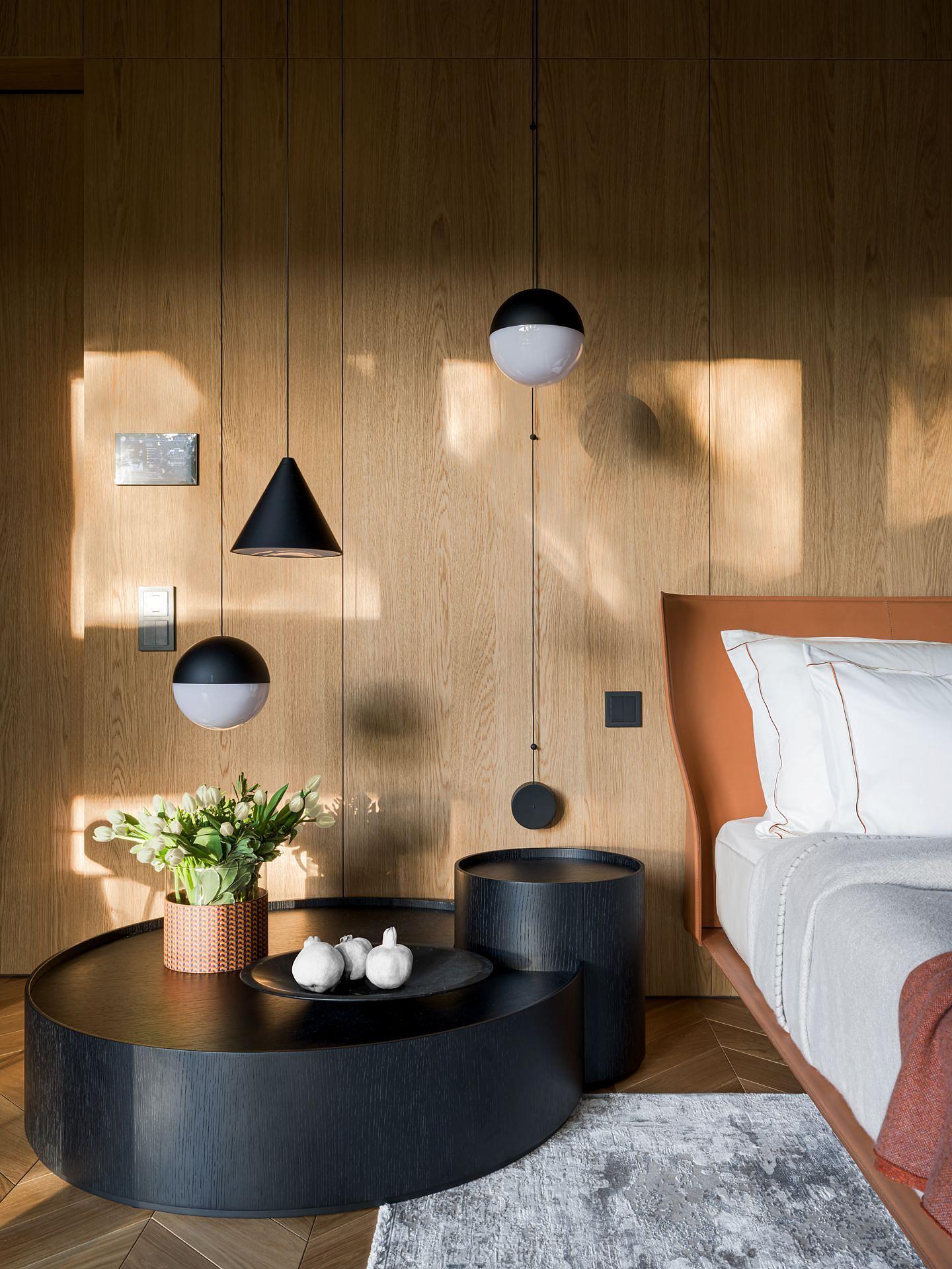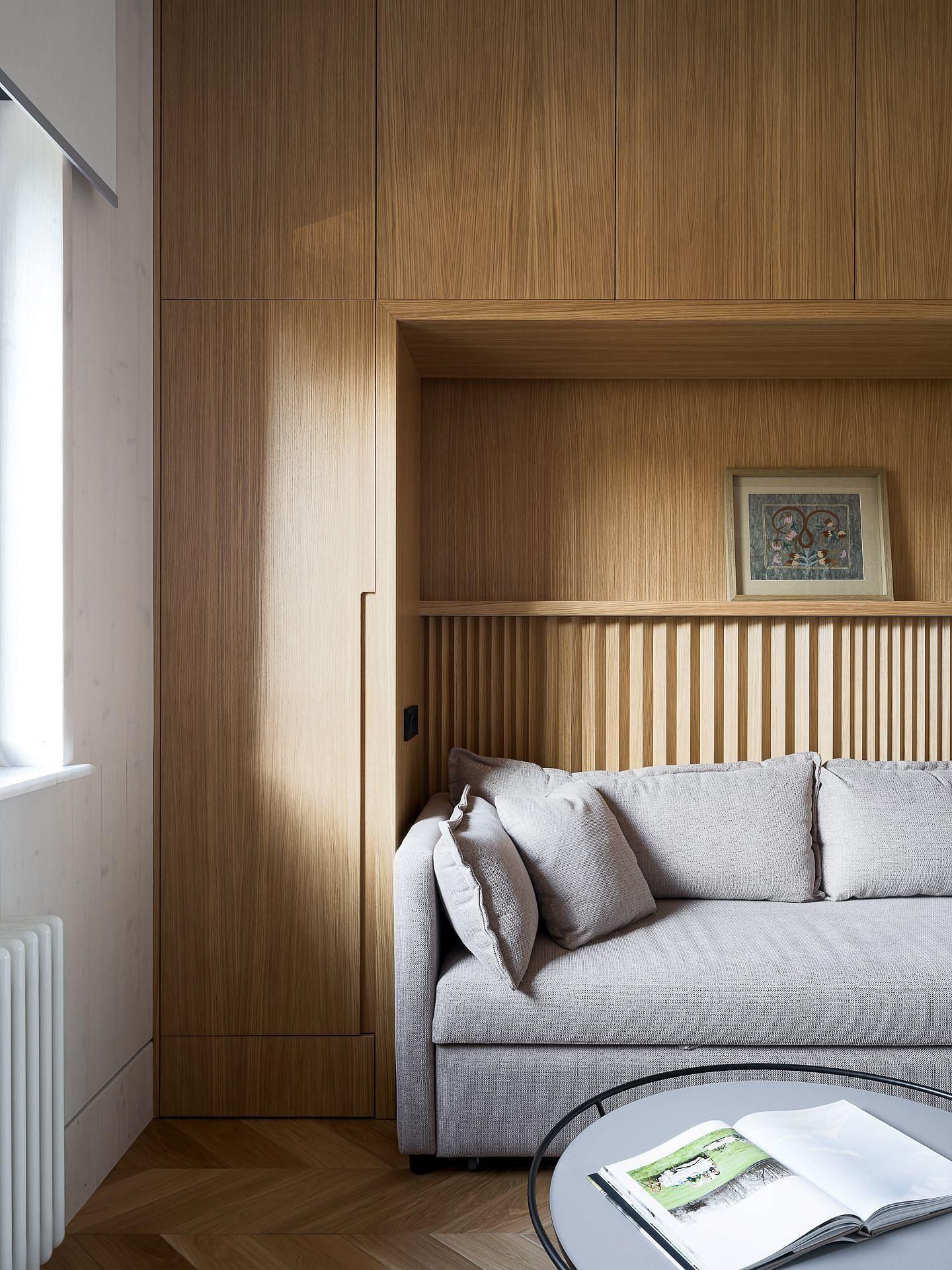 Тут господствует минимализм. Большие консоли. Строгая техника. Сочетания необычного рельефа акцентных деревянных поверхностей и ровный шпон.