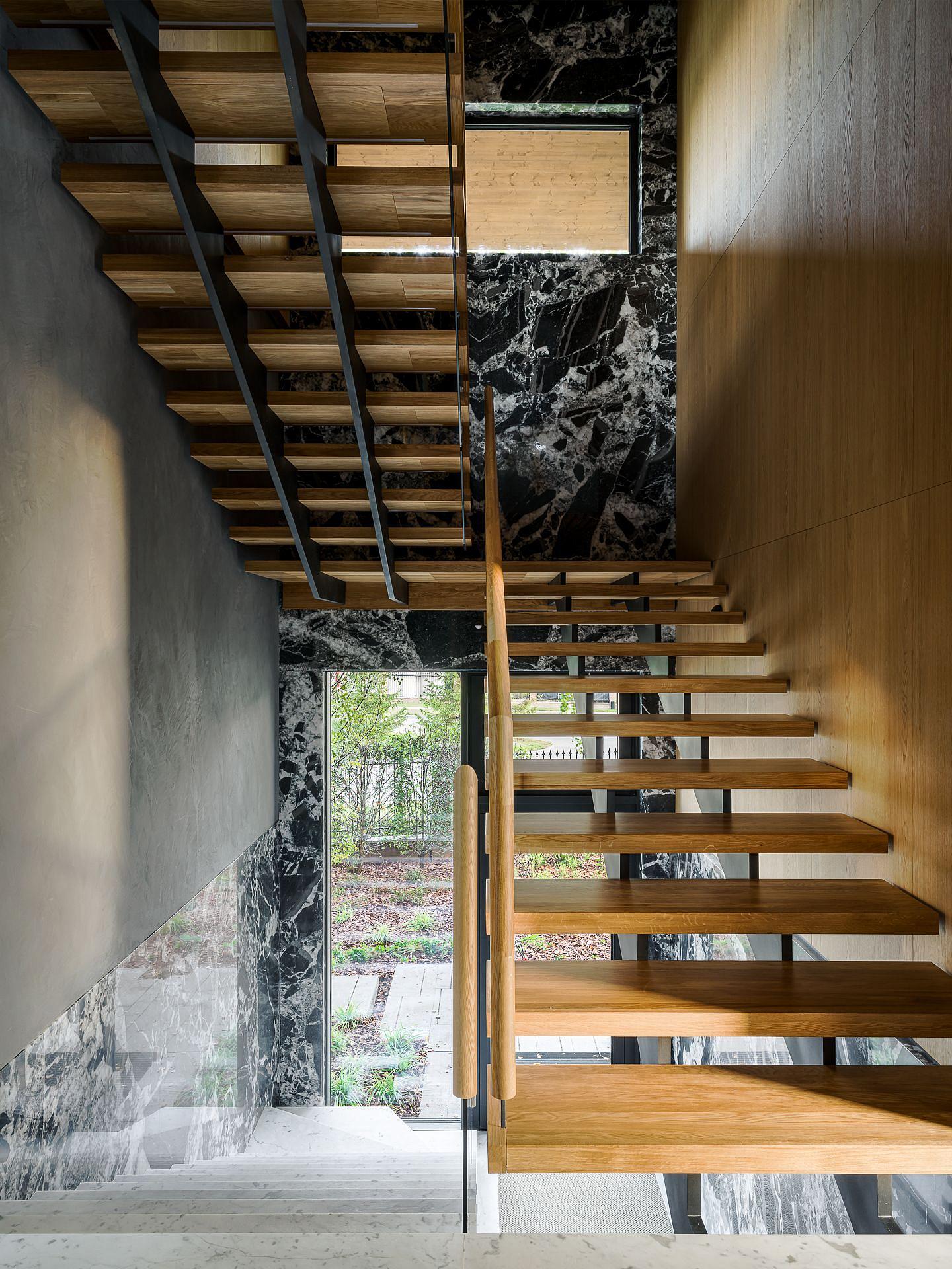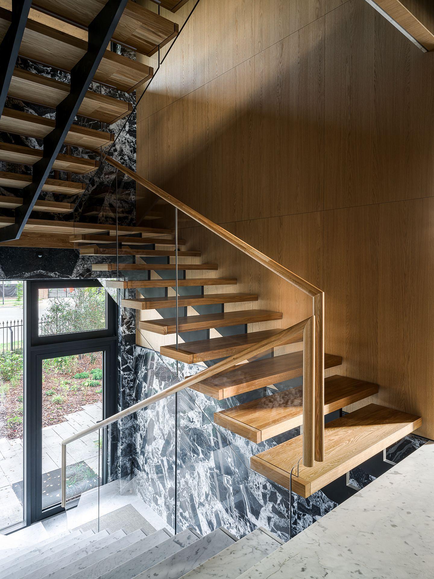 Элегантные скрытые системы хранения, крест джутового ковра заподлицо с плоскостью мраморного пола, легкая лестница с конструктивным стеклом несущим поручень, реечные потолочные системы - скрывают сложные инженерные решения по вентиляции и кондиционированию.