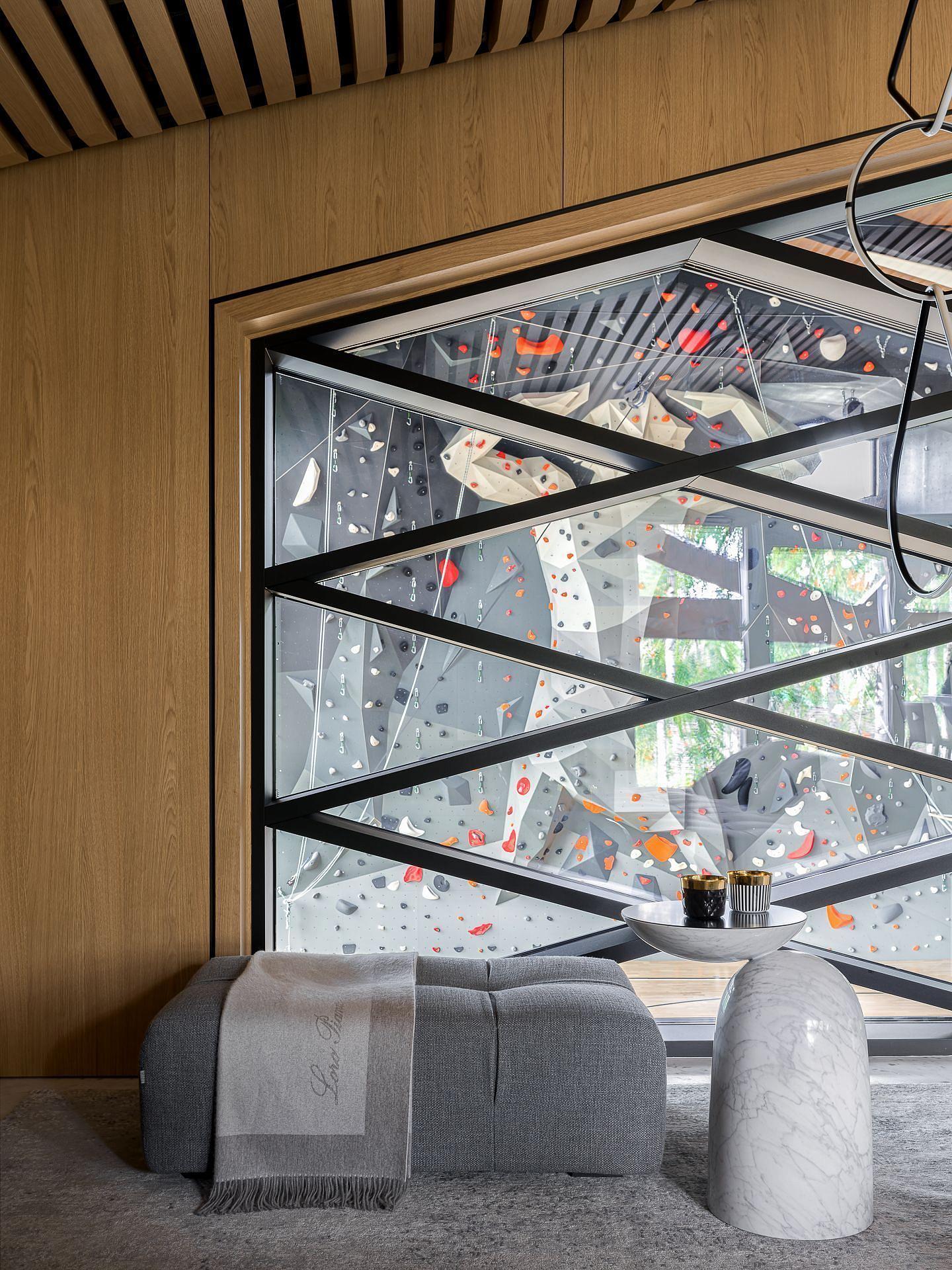 В спортивной зоне мы создали фигуру Атланта в эстетике аниме, близкой детям заказчиков. Зацепы образуют «пиратский моллюсковый риф», подсвечены и промаркированы для пяти маршрутов разной сложности. Автоматические лебёдки позволяют заниматься без напарника. С вершины скалодрома, через широкое шестигранное окно, открывается панорама — приз за отвагу.